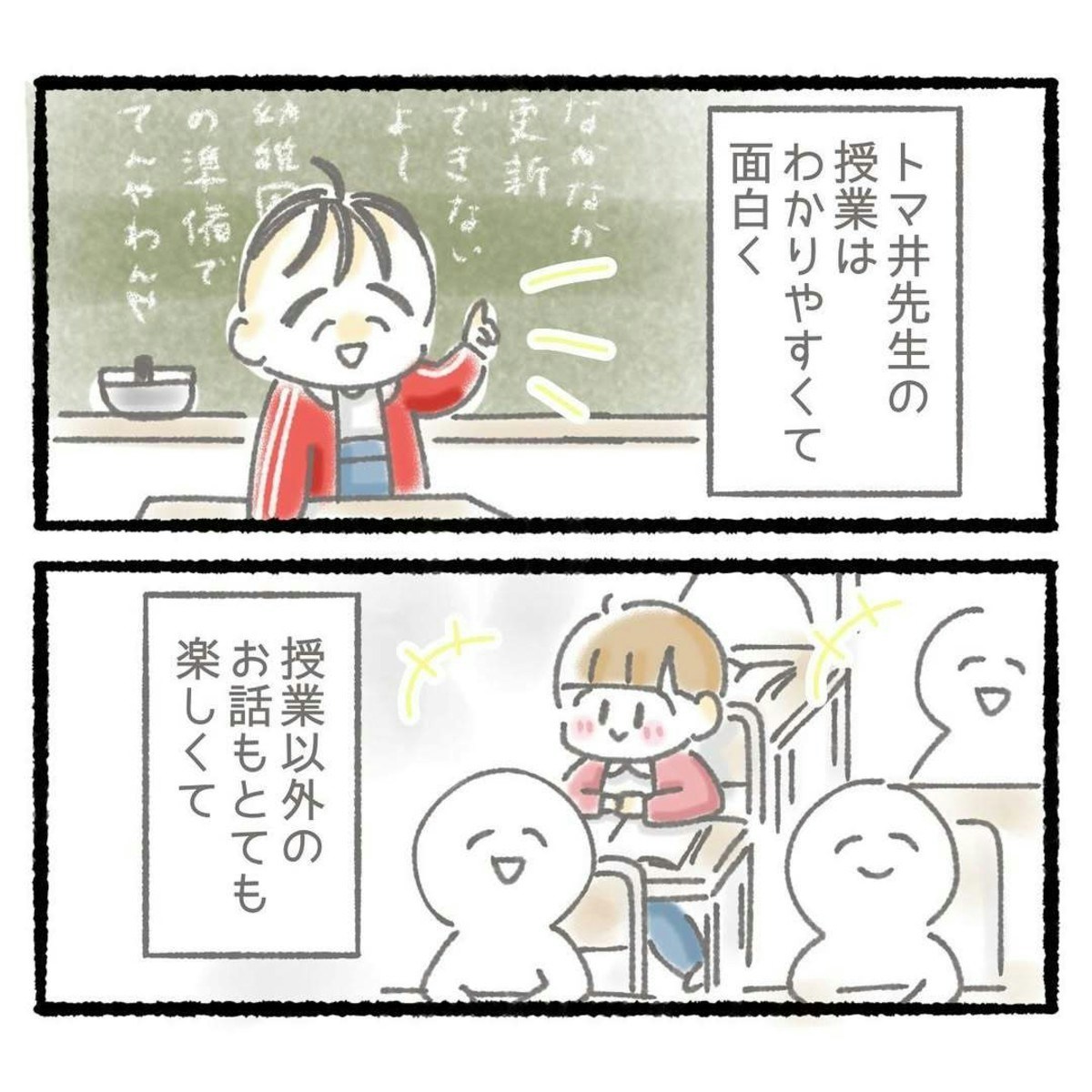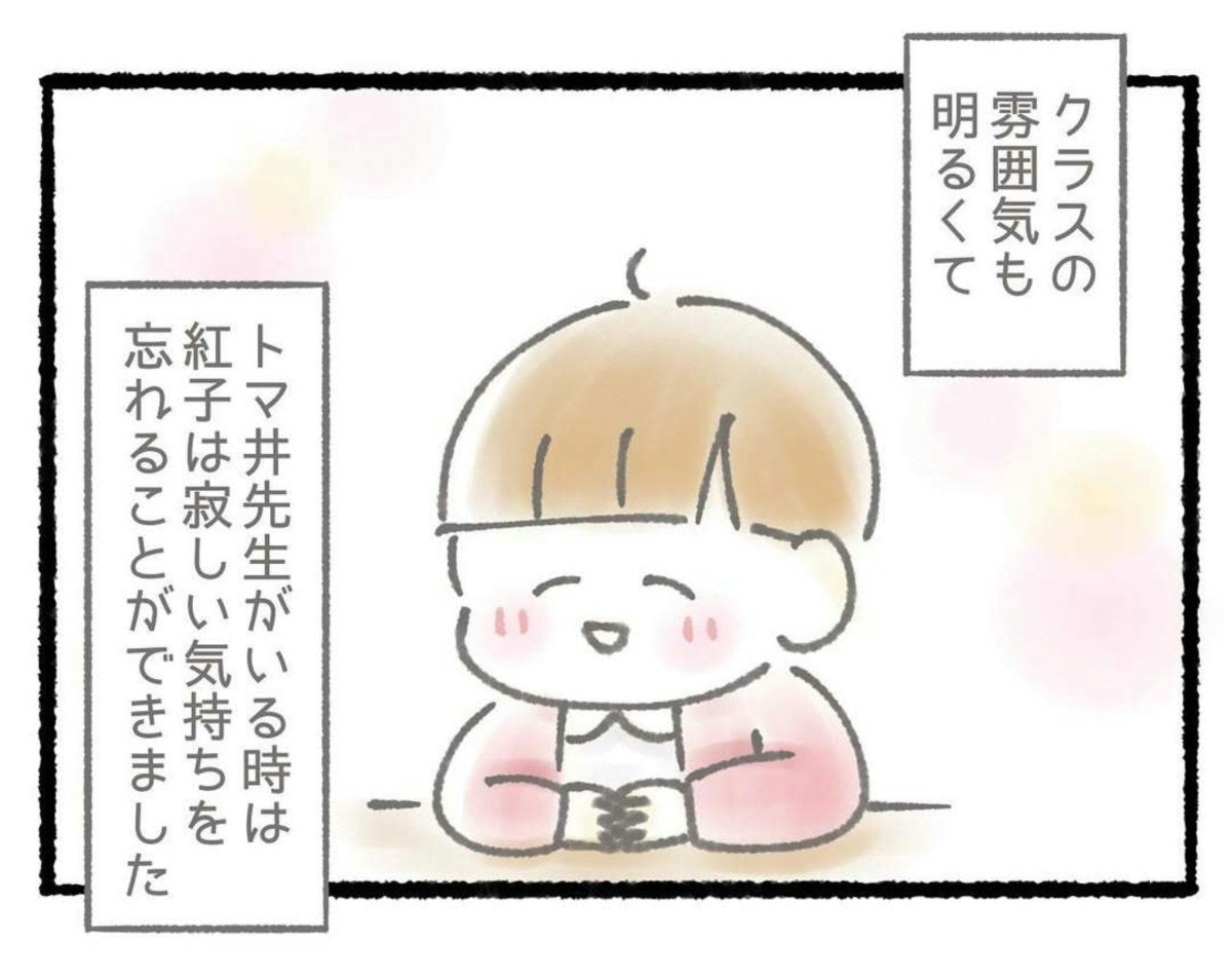 担任のトマ井先生の授業は面白く、クラスの雰囲気も明るくて良い感じ。先生がいる時は、寂しい気持ちを忘れられたという紅子さん。