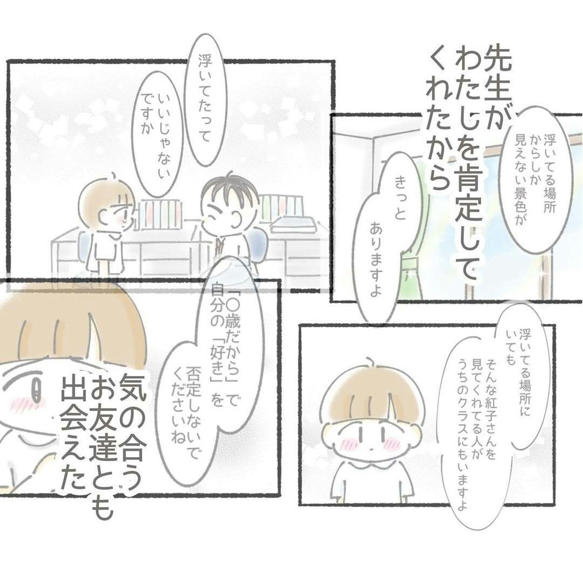 人を傷つける言葉も飛び交う世の中ですが、その人自身を見つめて理解し、肯定してくれる人もいます。紅子さんは先生からの言葉を受け取って依頼、落ち込んだり傷ついたりする度に先生の言葉を思い出して励まされているそうです。周囲に対して自分が「浮いている」と感じる人にも必ず居場所はあるということを教え、励ましてくれるようなお話でした。『浮いてる私を肯定した先生のはなし』は、紅ほっぺさんのInstagramで掲載中の作品です。