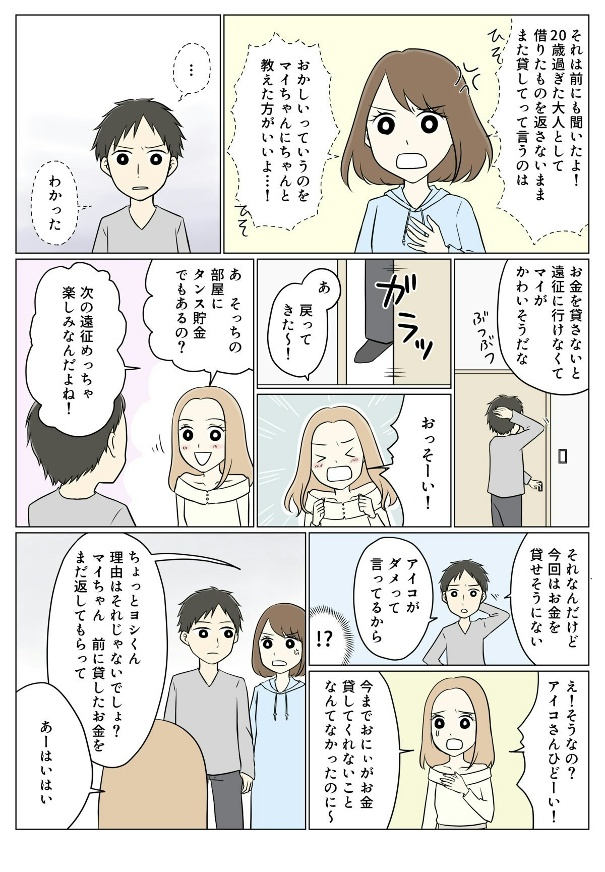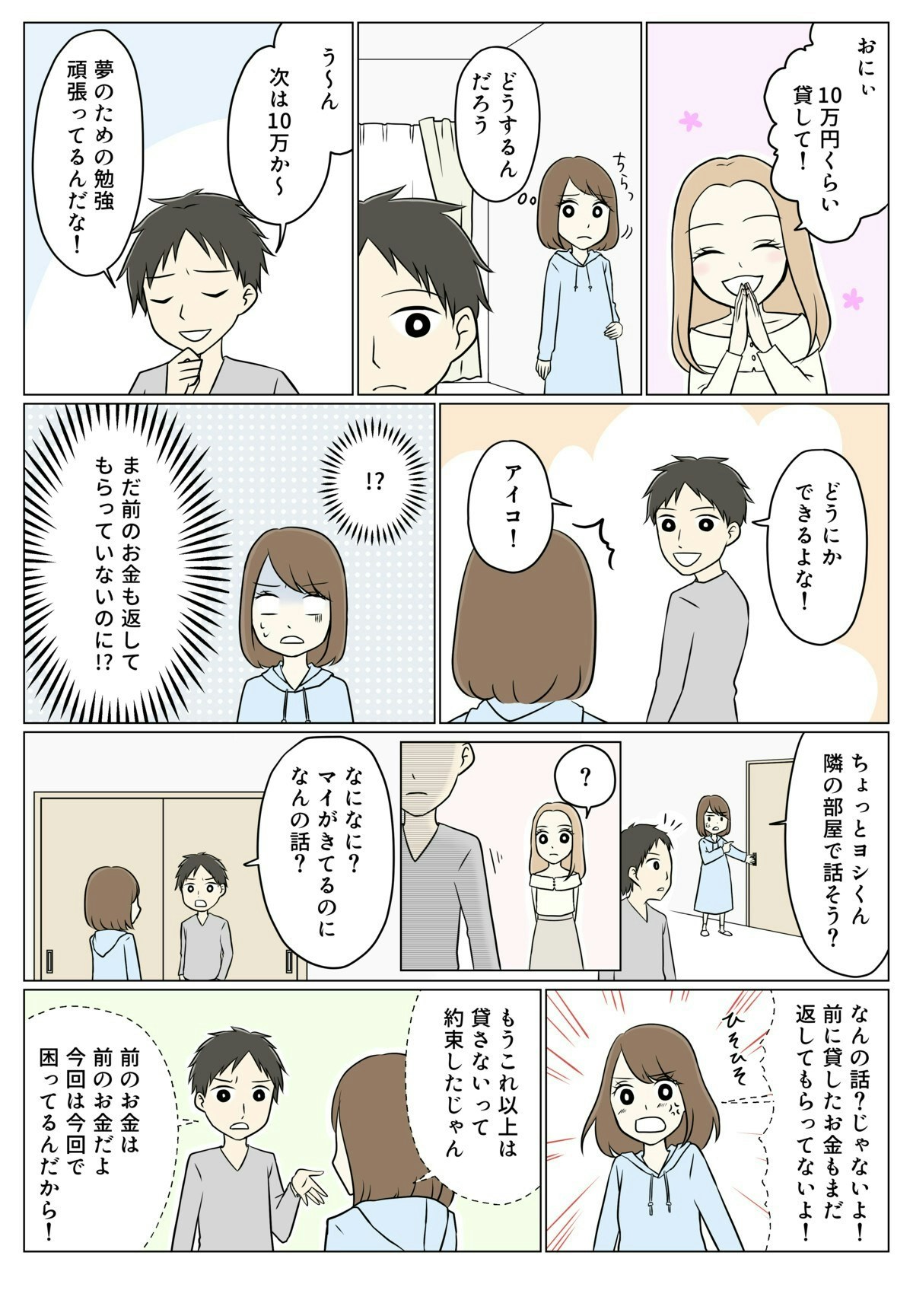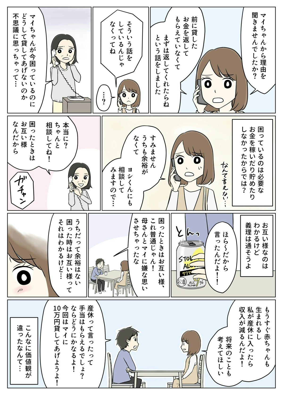 ある日、アイコさんと夫のヨシさんのもとに、夫の妹・マイさんから「お金を貸してほしい」という連絡が入ります。しかし、アイコさんは妊娠中で、これから何かと出費が増える時期。できれば貸したくないと思っていましたが、夫は「家族だから助けるべきだ」と譲らず、結局お金を渡すことに。