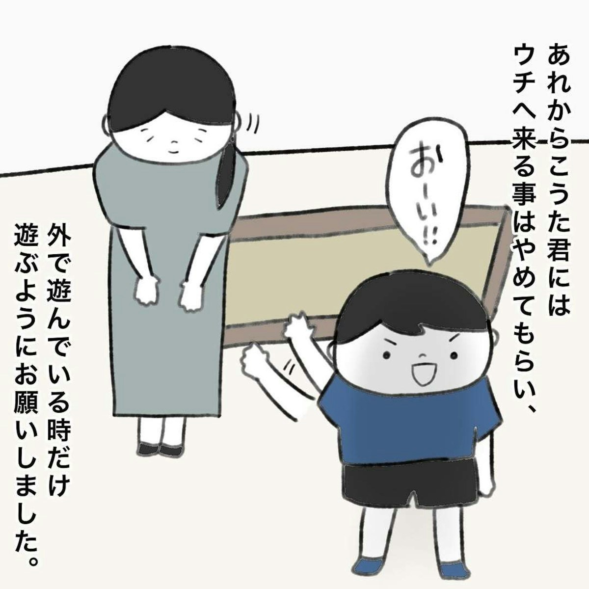 かかじりさんは、こうたくんの行動に対して何度も注意をしましたが、彼の行動はどんどんエスカレート。さらに、こうたくんの母親はいつも一歩引いて見ているだけで、問題が解決される気配がありません。こうたくんが1人で遊びに来ることも、かかじりさんにとってかなりの心理的負担となり、距離を置く決断をします。