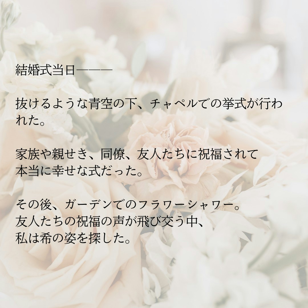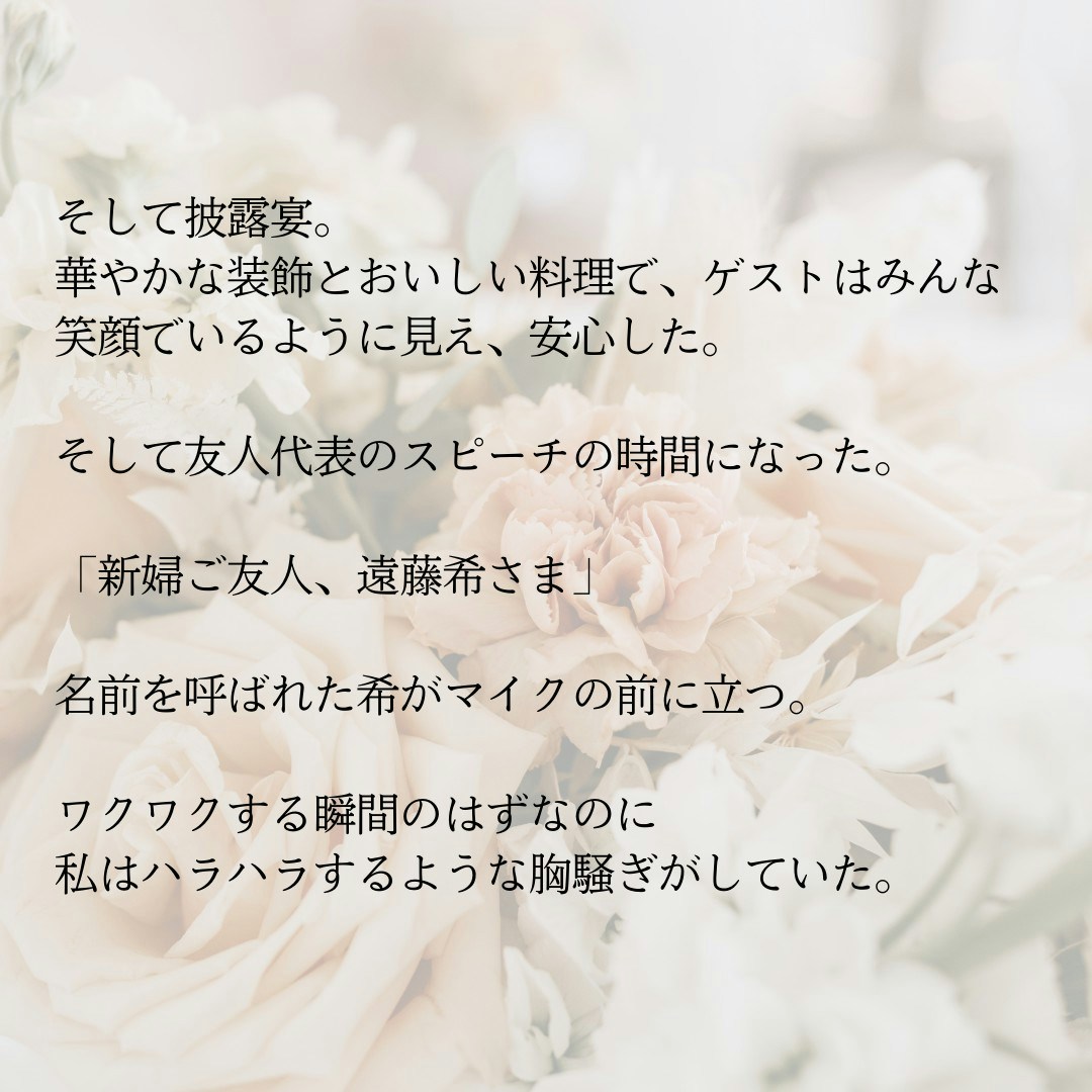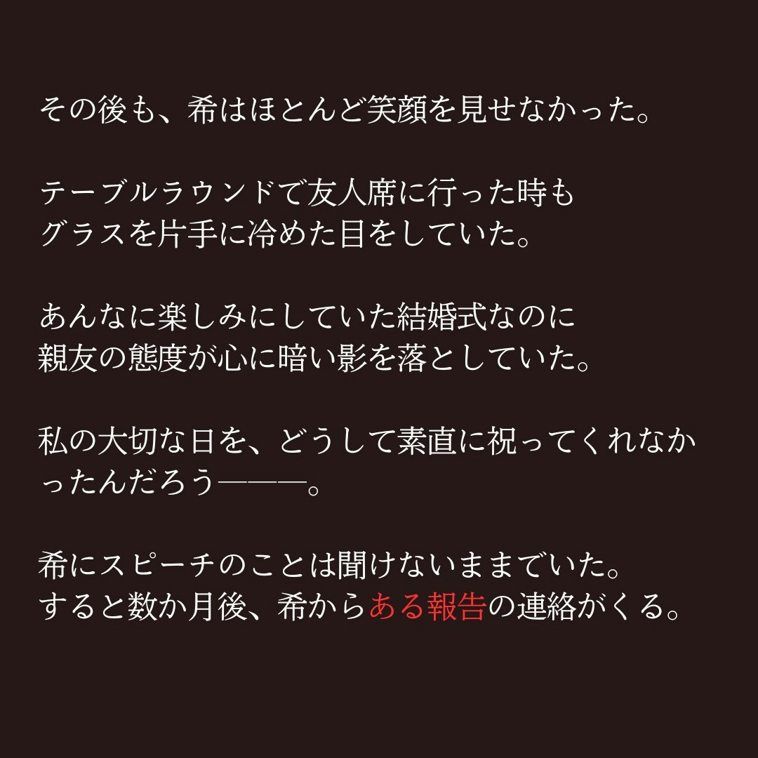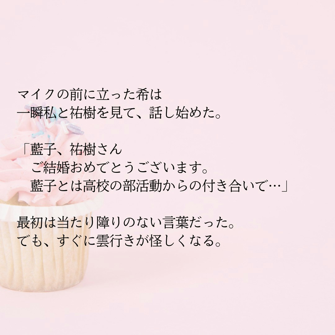 藍子と夫・祐樹はついに結婚式の日を迎えました。幸せを祝う友人に囲まれた楽しい式になる予定でしたが、親友・希のスピーチの内容により、悪い意味で忘れられない式になってしまうのでした…。