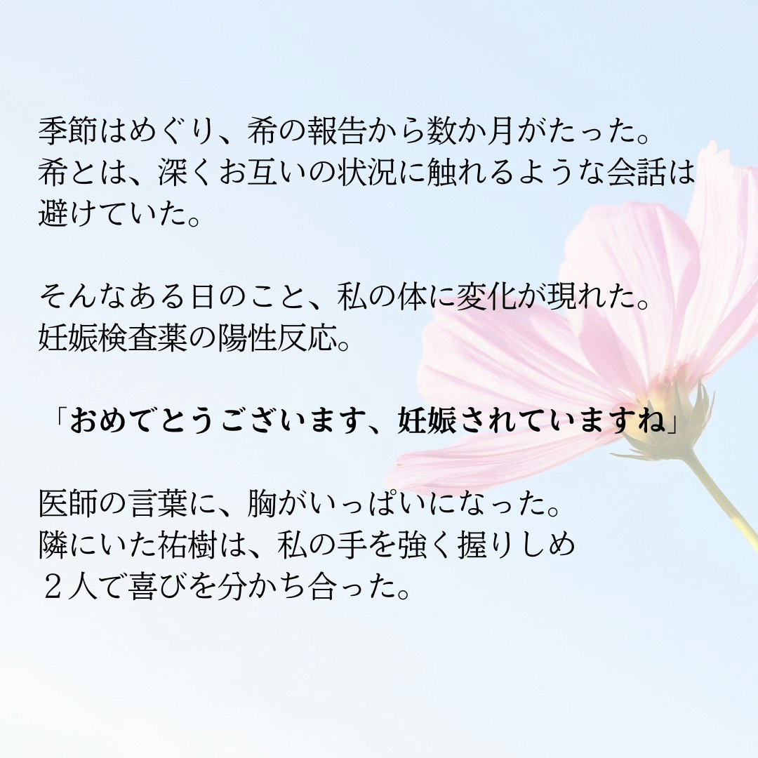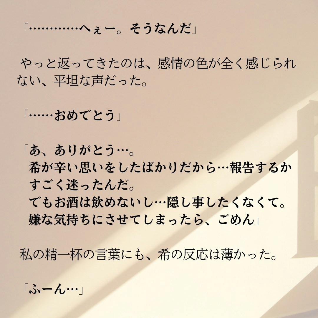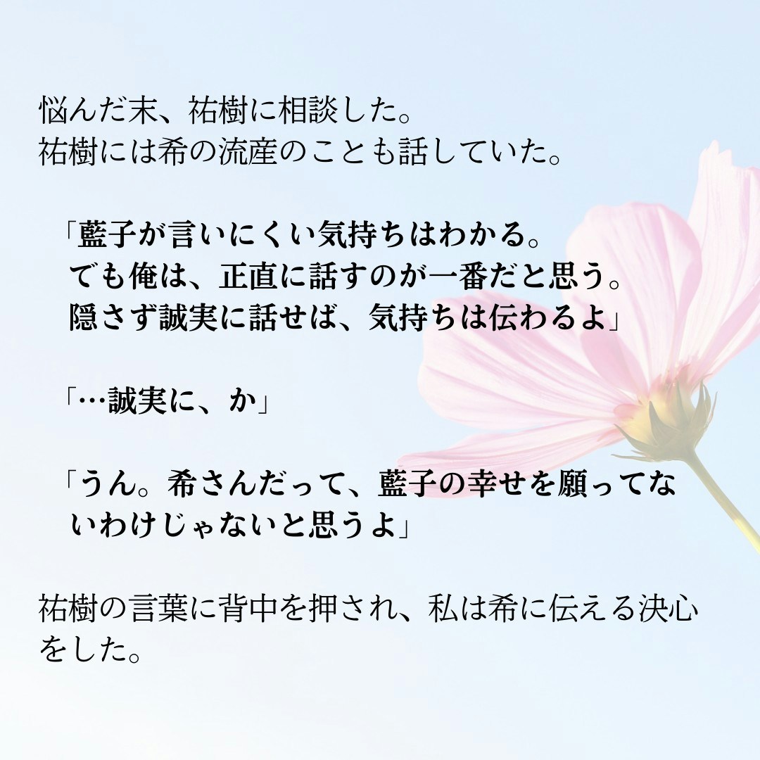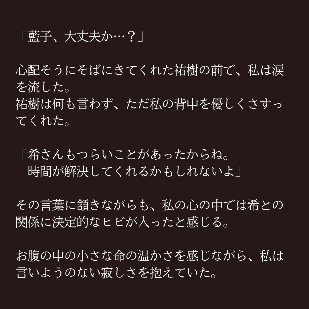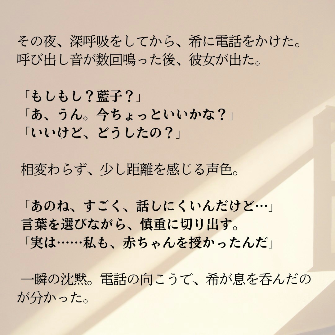 希による妊娠・流産の報告から数か月。今度は藍子も妊娠したことが判明します。夫婦で待ち望んでいたこととはいえ、妊娠の事実を希に伝えるか、藍子は悩みを抱えるのでした。