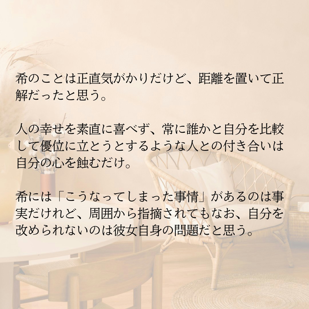 嫉妬心で相手を攻撃する人との決別を描く作品
