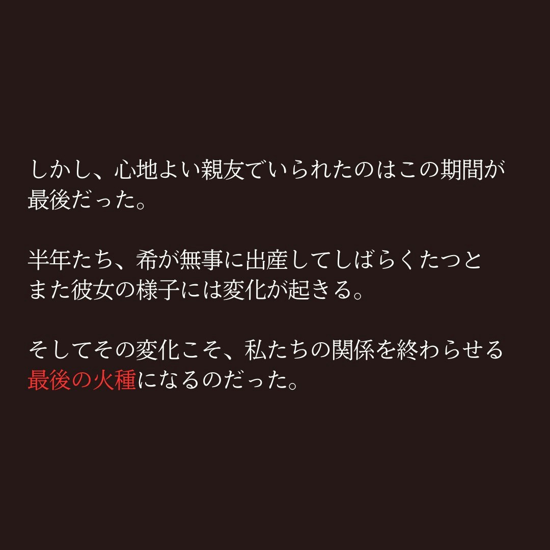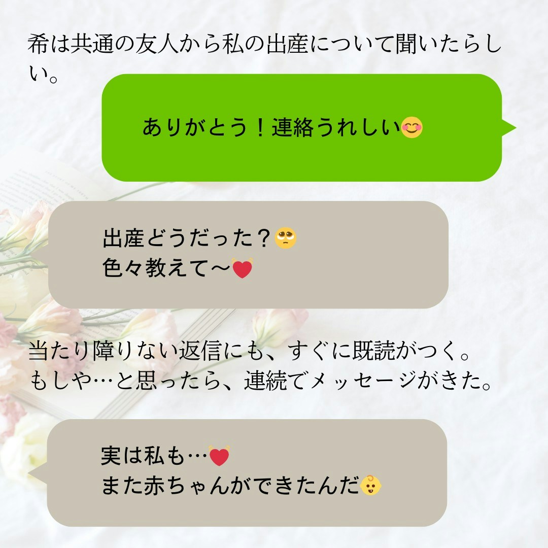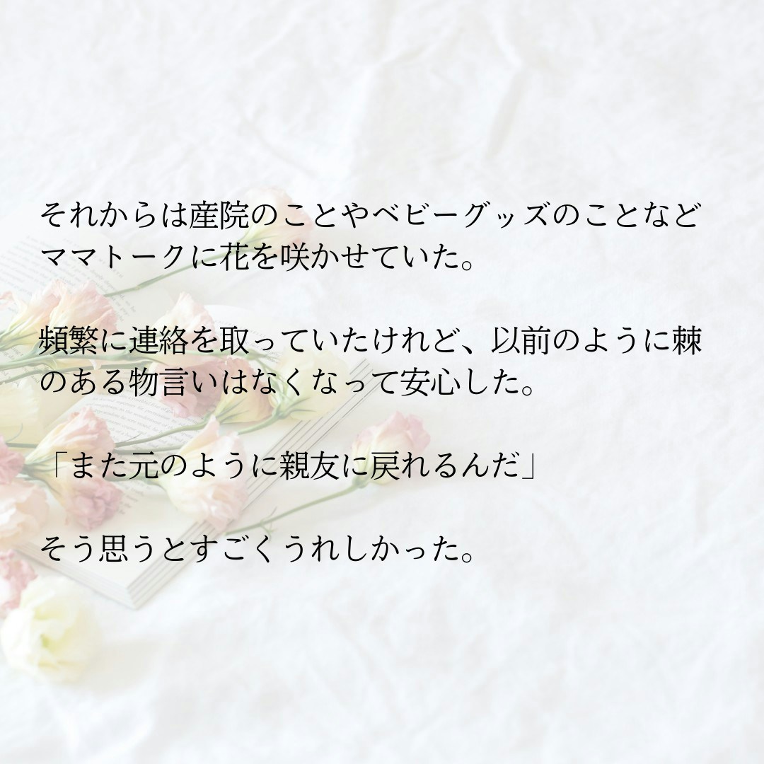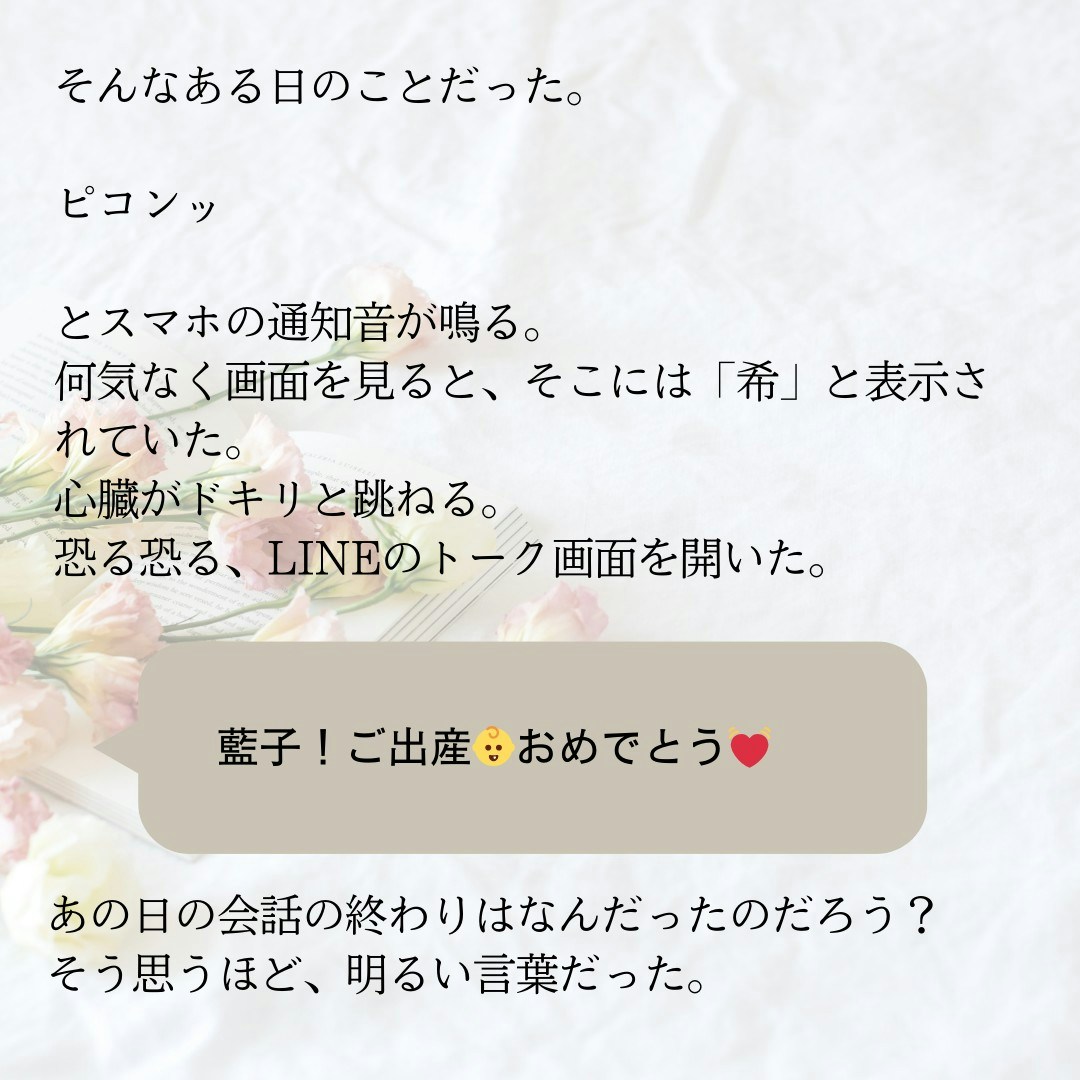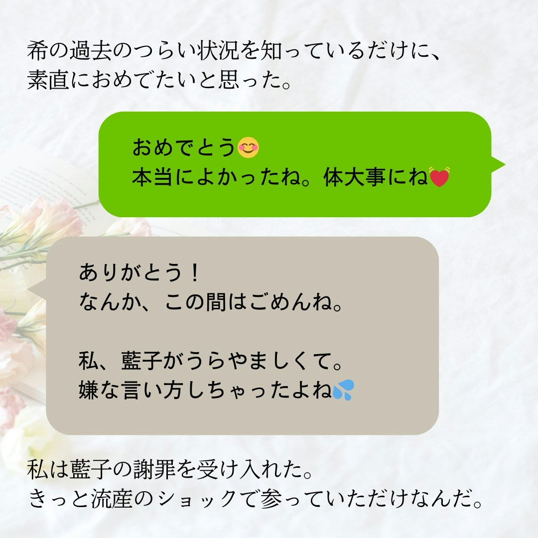 出産を終え、娘の愛らしさに癒やされる日々を送っていた藍子。そこに、数か月前にLINEでもめた親友・希からのメッセージが届きます。一瞬ドキッとする藍子ですが、その内容はかつてのトゲトゲしいものとはまったく違う内容でした。