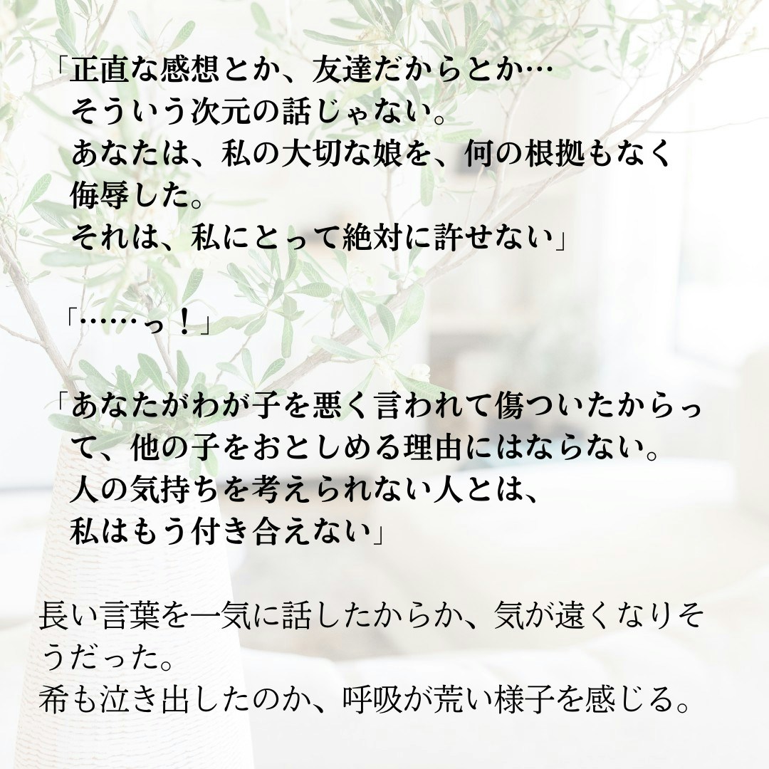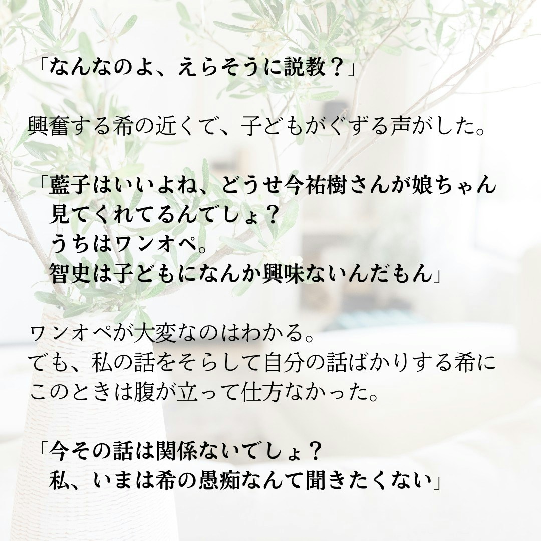 藍子の娘に対し「能力低そう」と驚きのサゲ発言をした希。我慢できなくなった藍子から強い言葉でとがめられても態度を改める様子がありません。これまで希との関係性を保ちたいと思ってきた藍子ですが。ついに絶縁を言い渡します。