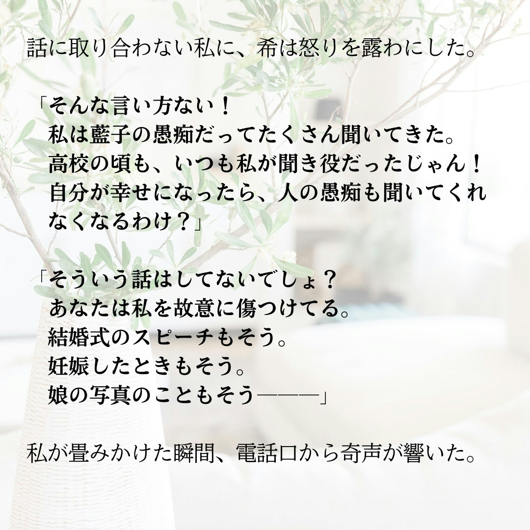藍子は大人になっても希と昔のような付き合いができることを望んでいましたが、希は密かに藍子に対し嫉妬心をつのらせていました。藍子の暮らしに対して「自分よりも優れている」と劣等感をいだいた希は、徐々に藍子に対して意地悪な言動をするようになっていきます。