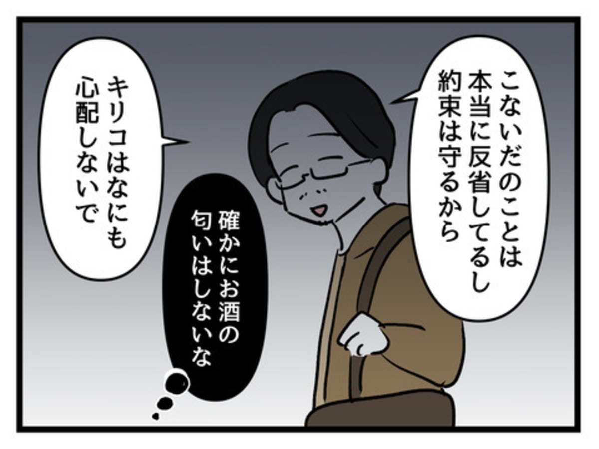 キリコさんに残業と嘘をつき、食事をしながら相談にのってもらっていたりょうじさん。そーっと帰宅すると、なんとそこには寝ているはずのキリコさんの姿が!!「飲んできたんじゃない?」と疑われたりょうじさん。彼はどんな反応をしたのでしょうか。