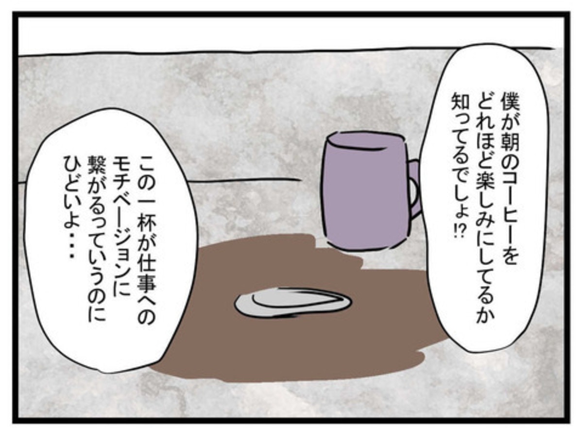 かすみさんは、「コーヒーを飲むな」とは言っていないのに、夫・すぐるは意見をゆずりません。簡単なお願いも受け入れてくれない すぐる。それどころか、「自分は外で働いて稼いでいるんだから、家のことをもっと頑張ってくれ」と言い始め…。