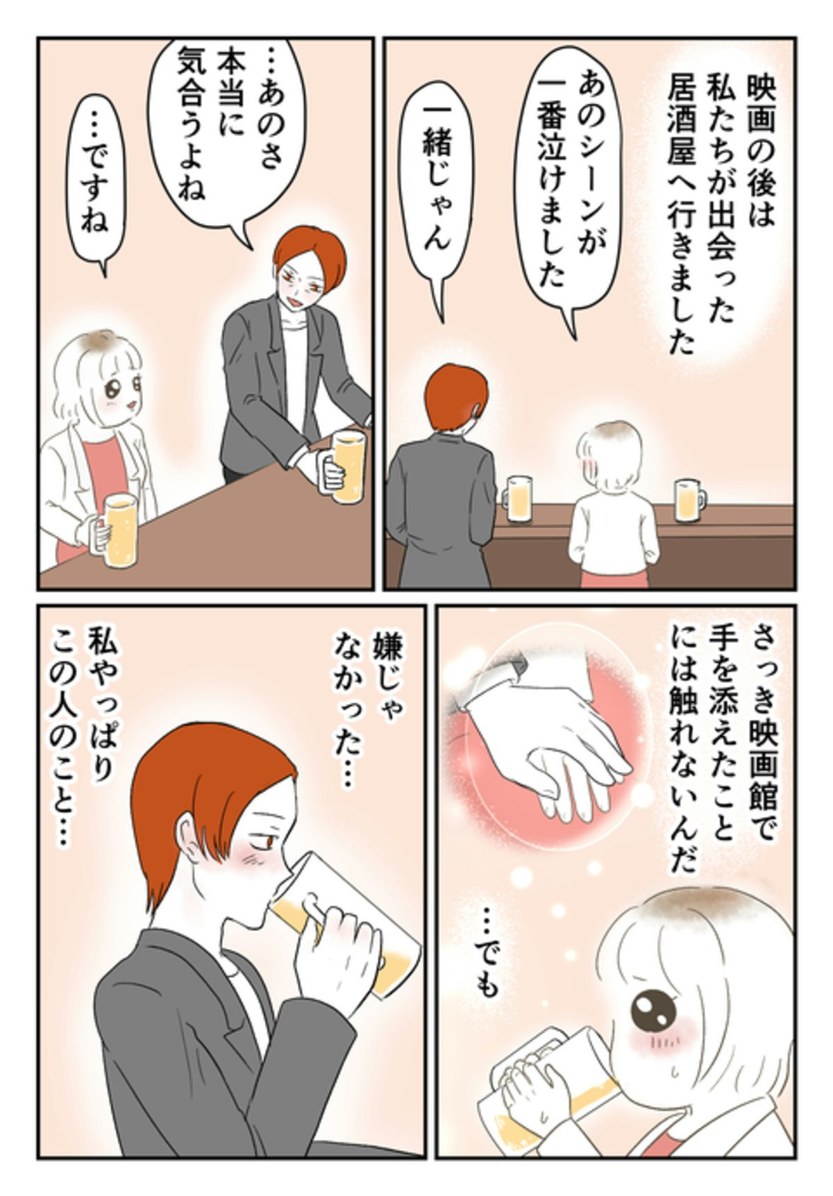 映画鑑賞後、出会いの場所となった居酒屋で感想を伝え合う2人。映画館で手がふれたことを意識する尾持さんは、モトさんへの好意が高まって行くことを感じているようです。