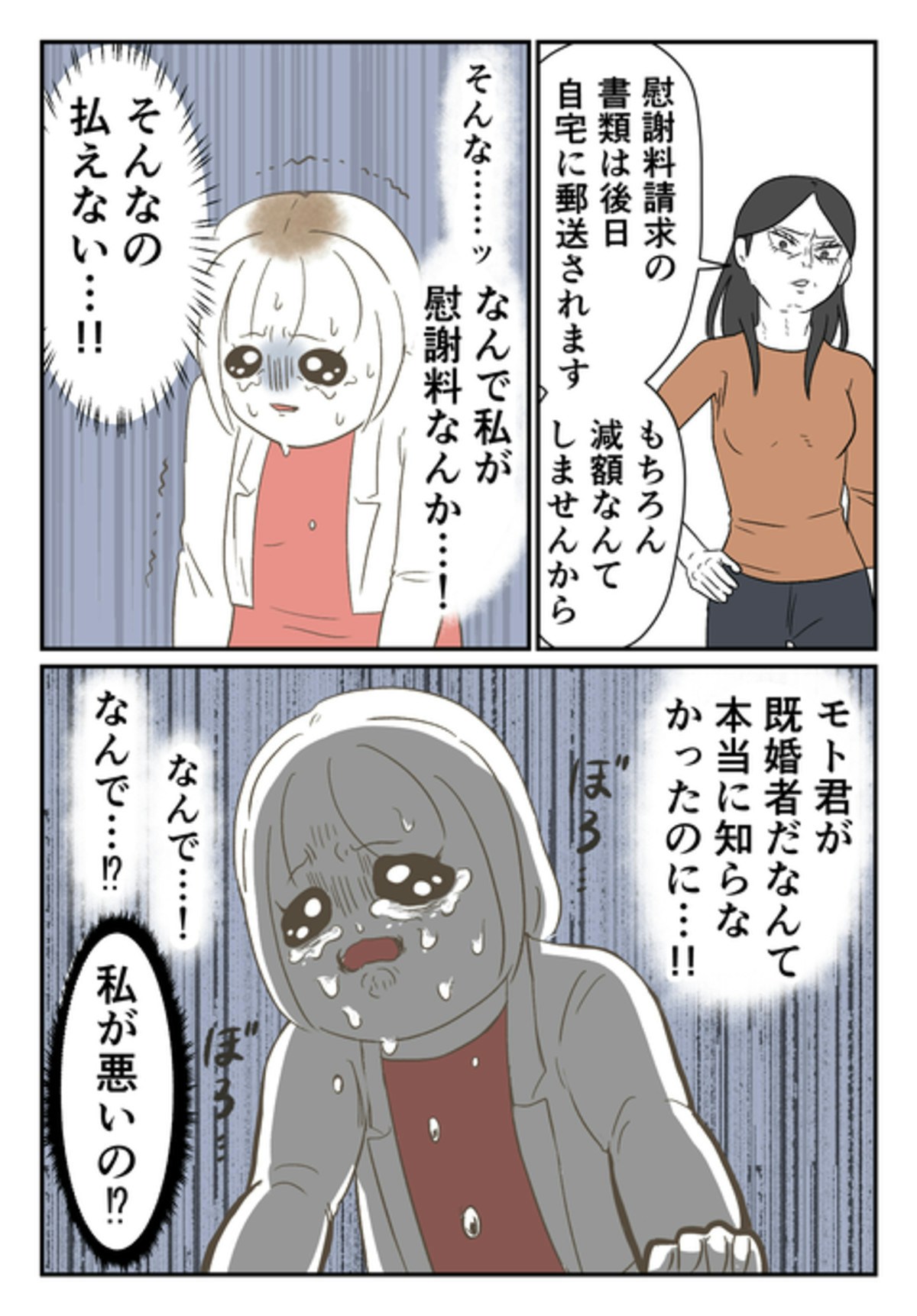 モトさんが「既婚者」であることを、本当に知らなかった尾持さん…。ですが、妻はその主張を信じようとはしません。「慰謝料を請求する」と言われ、尾持さんの目からは涙があふれます。