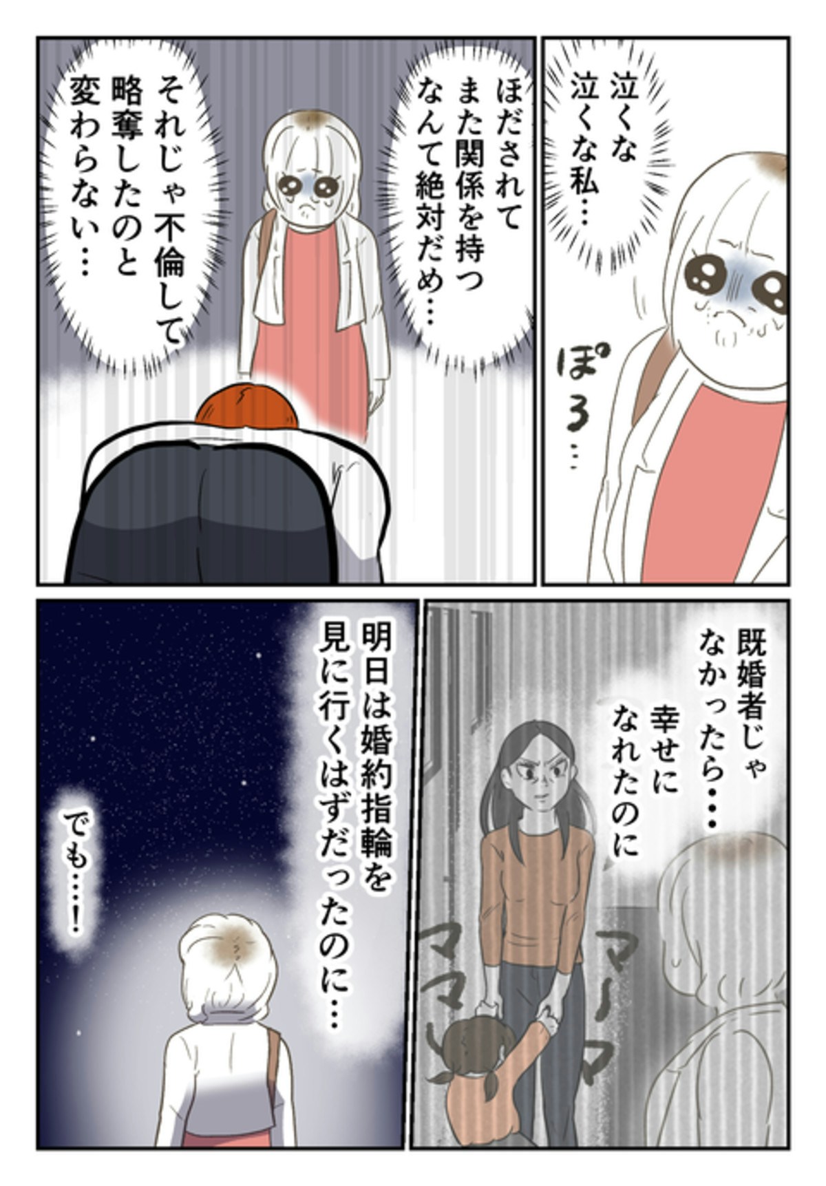 「別れたくない」と泣きわめくモトさんを見て、少しほだされそうになった尾持さん。しかし、ここでほだされたら、ただの略奪になってしまいます。