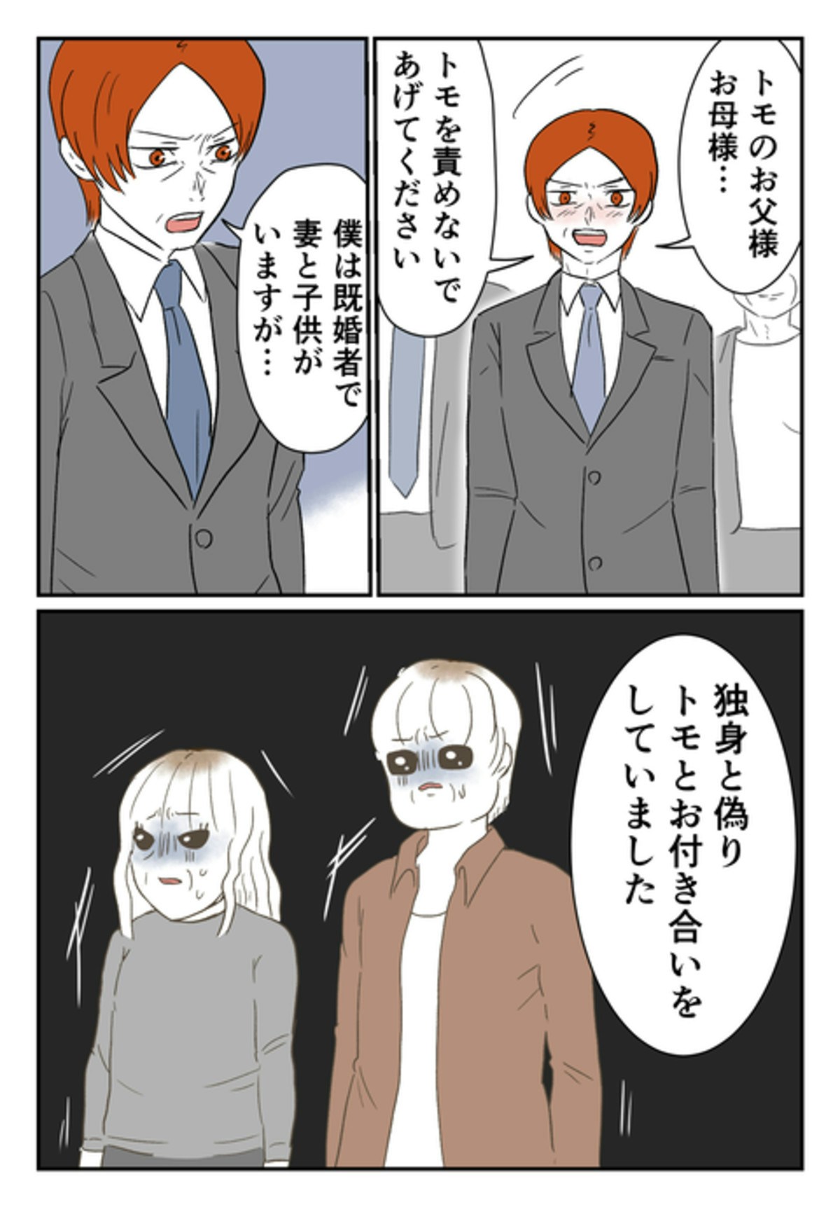 モトさんは、「既婚者」であることを告げずに交際していたことを、尾持さんの両親に打ち明けます。「娘に傷を負わせた」と、尾持さんの両親から責められますが、モトさんは怯みません。