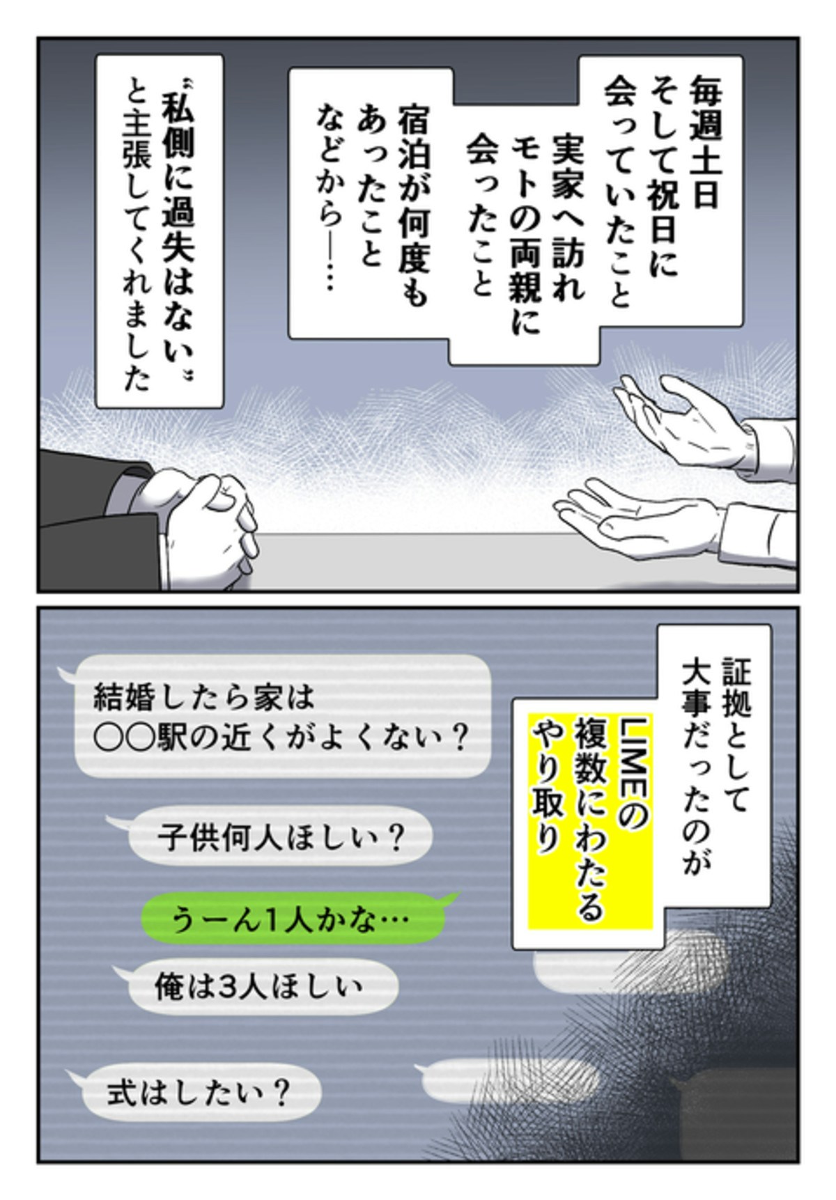 モトさんが「既婚者」であることを、かくして付き合っていたことは、メッセージのやりとりで証明できそうです。弁護士はモトさんの妻の弁護士と話し合いをすることになりました。