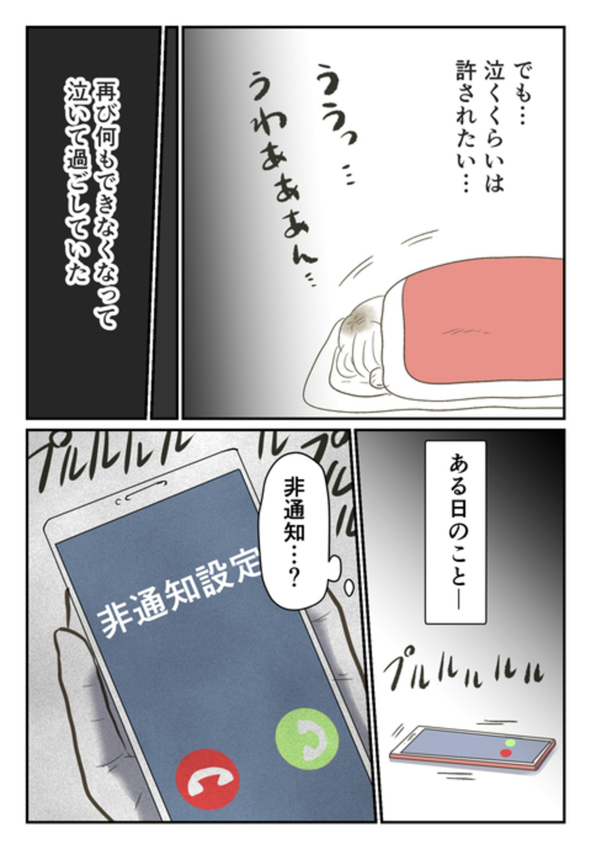 モトさんの妻や両親からの言葉を思い出し、深く傷つく尾持さん…。罪悪感と同時に、行き場のない苦しみに活力をうしなっていました。そんなある日、非通知設定の電話がかかってきます。
