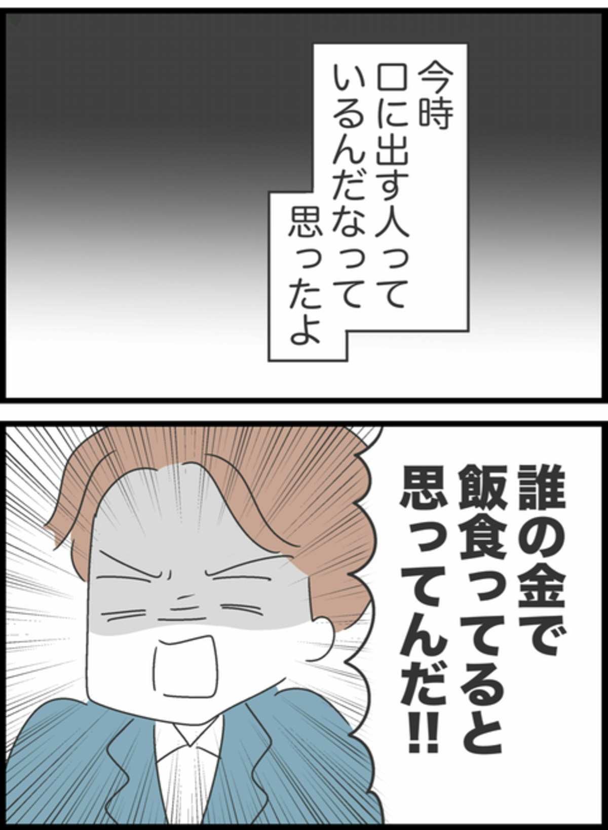 夫・しょうたが放った「誰の金で飯食ってると思ってんだ!!」という言葉。妻・ようこは、いつかは言うだろうと思っていたようです。専業主婦の妻は最も言われたくない言葉かもしれませんね。