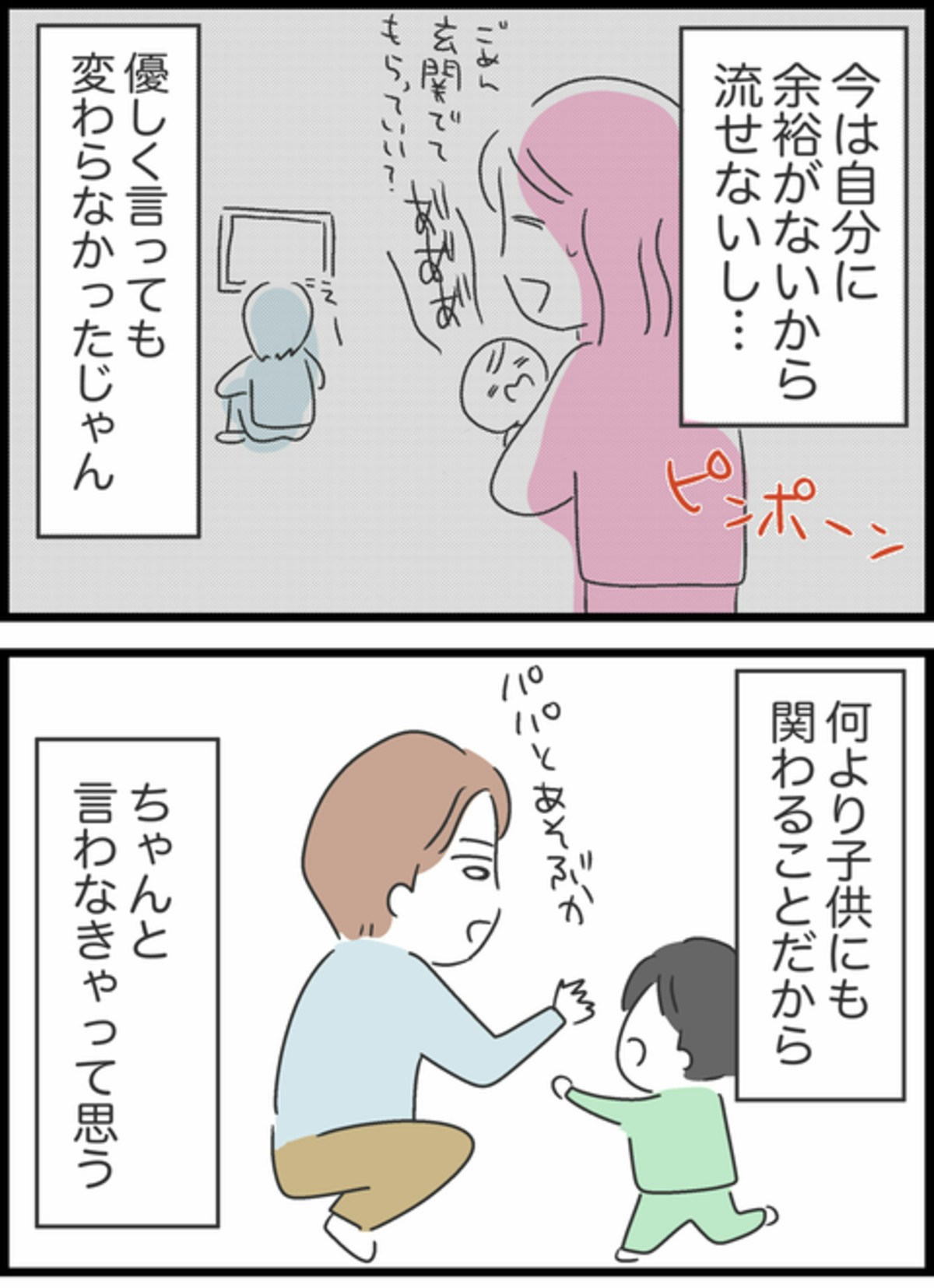 「言い方がキツくなった」とようこに言い、面倒くさそうに息子・ゆうたの面倒をみるしょうた。ようこだってそんなこと言いたくないのに言わせているのは、「どこのどいつだ!?」と頭に血が上ります。