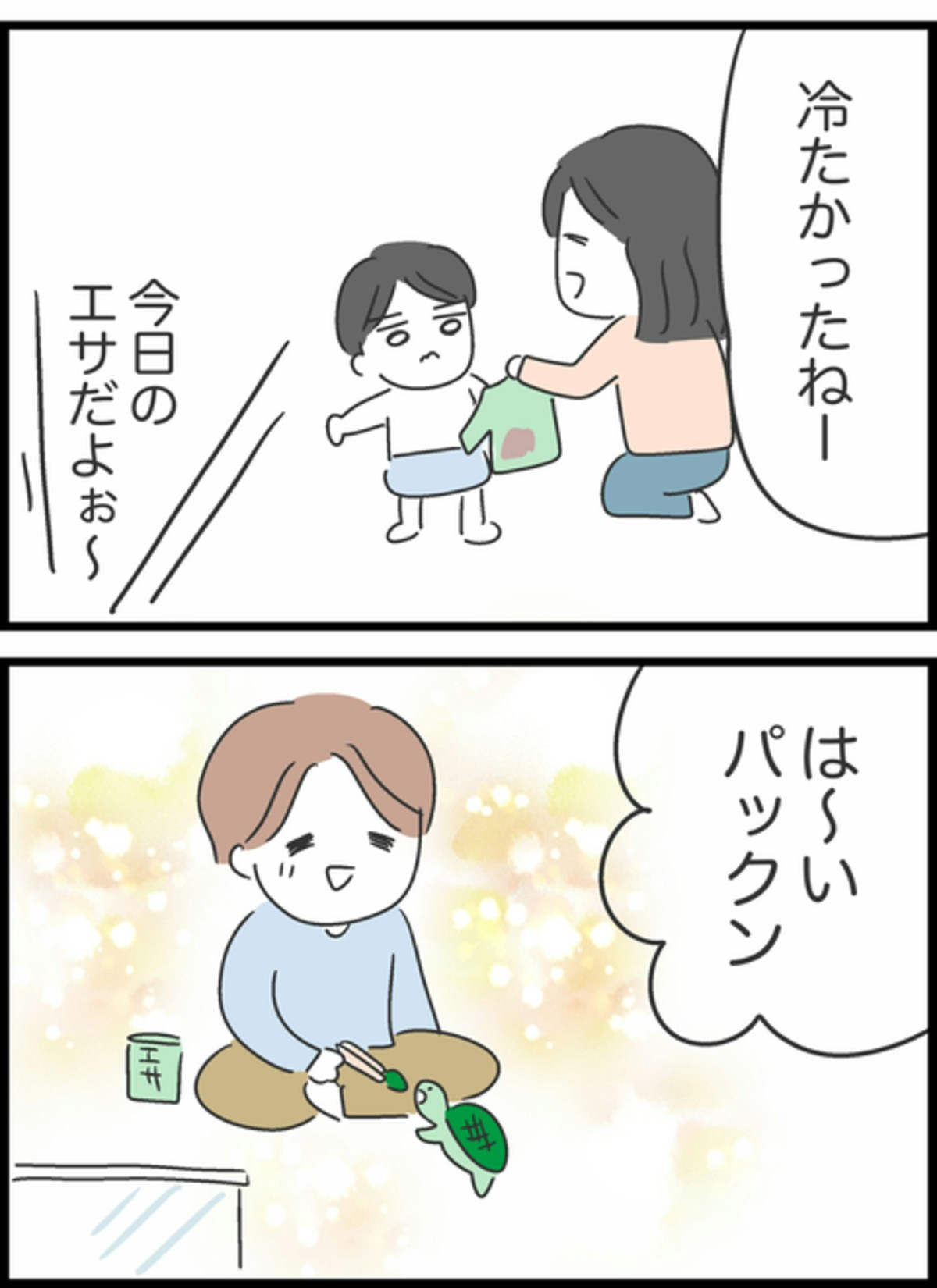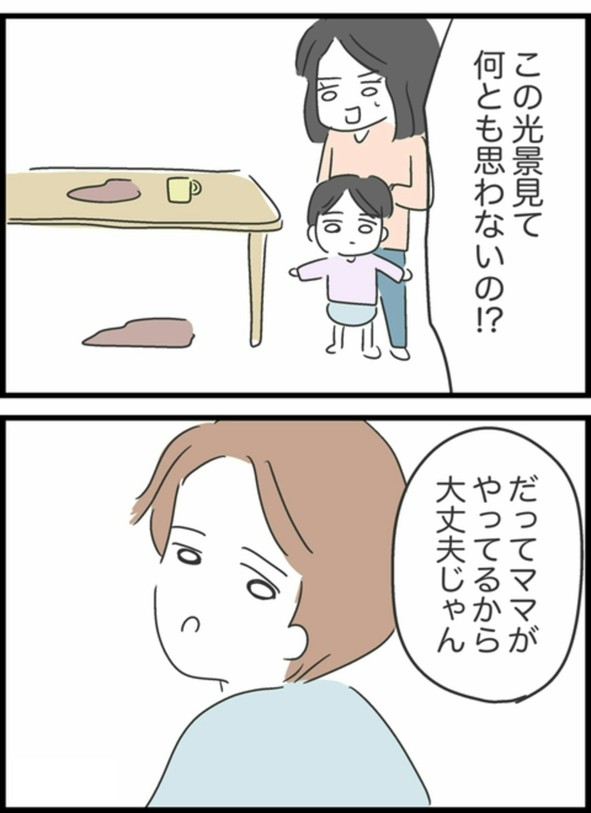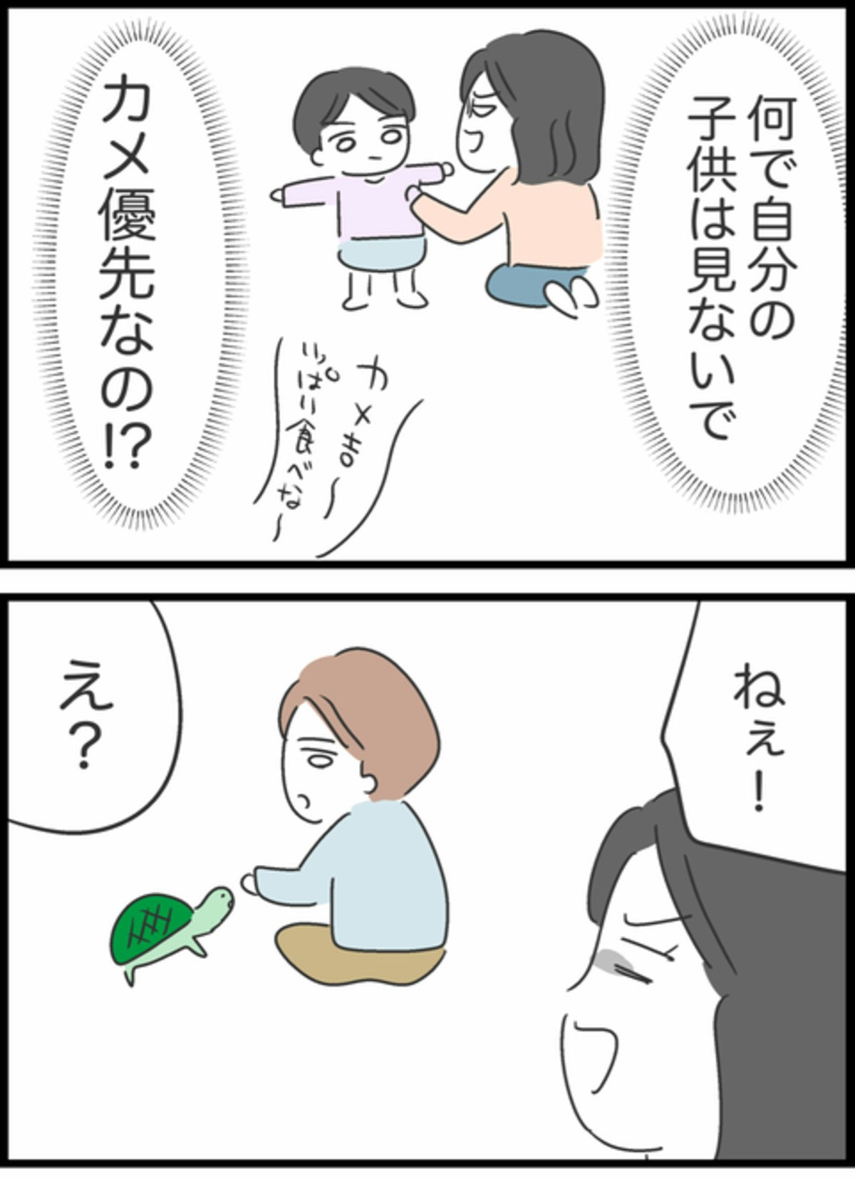 ゆうたが2歳のころ、飲み物をこぼしたため着替えさせていたようこ。せかせかとようこが動く一方で、しょうたはカメにえさをあげていて…。