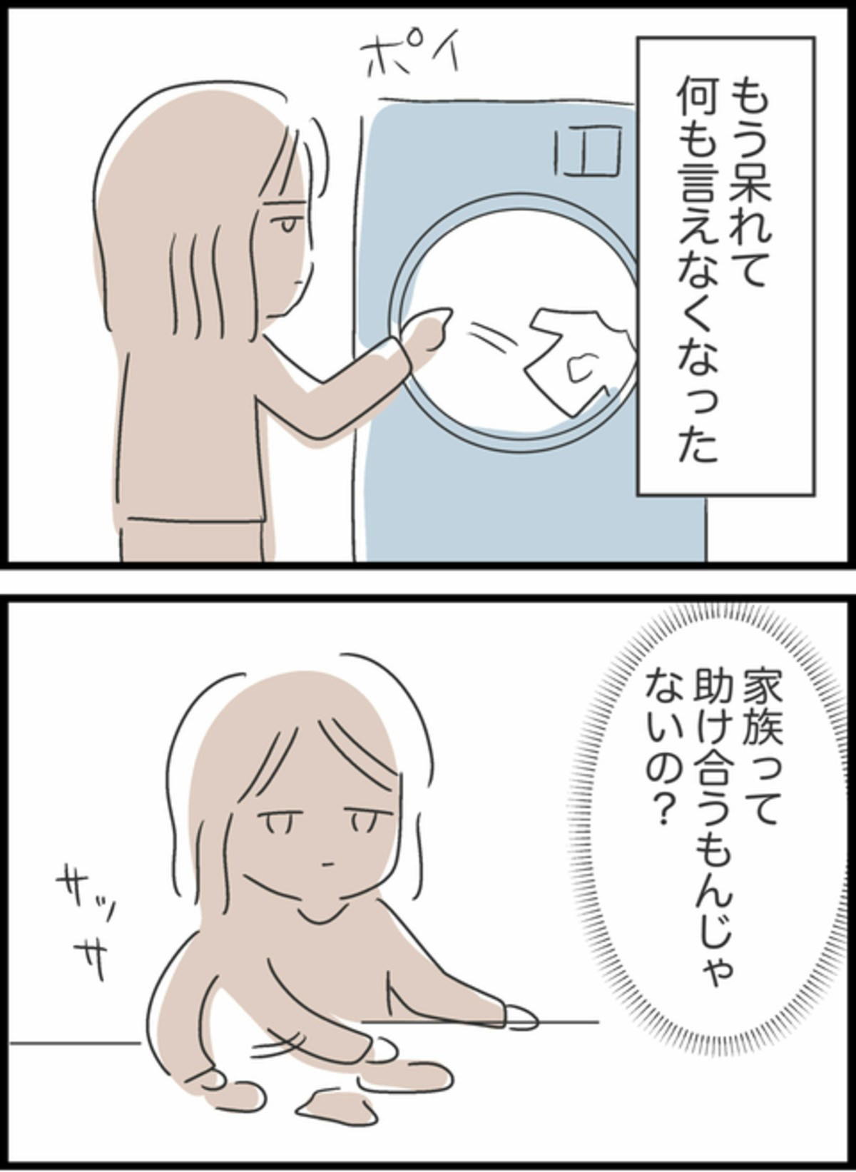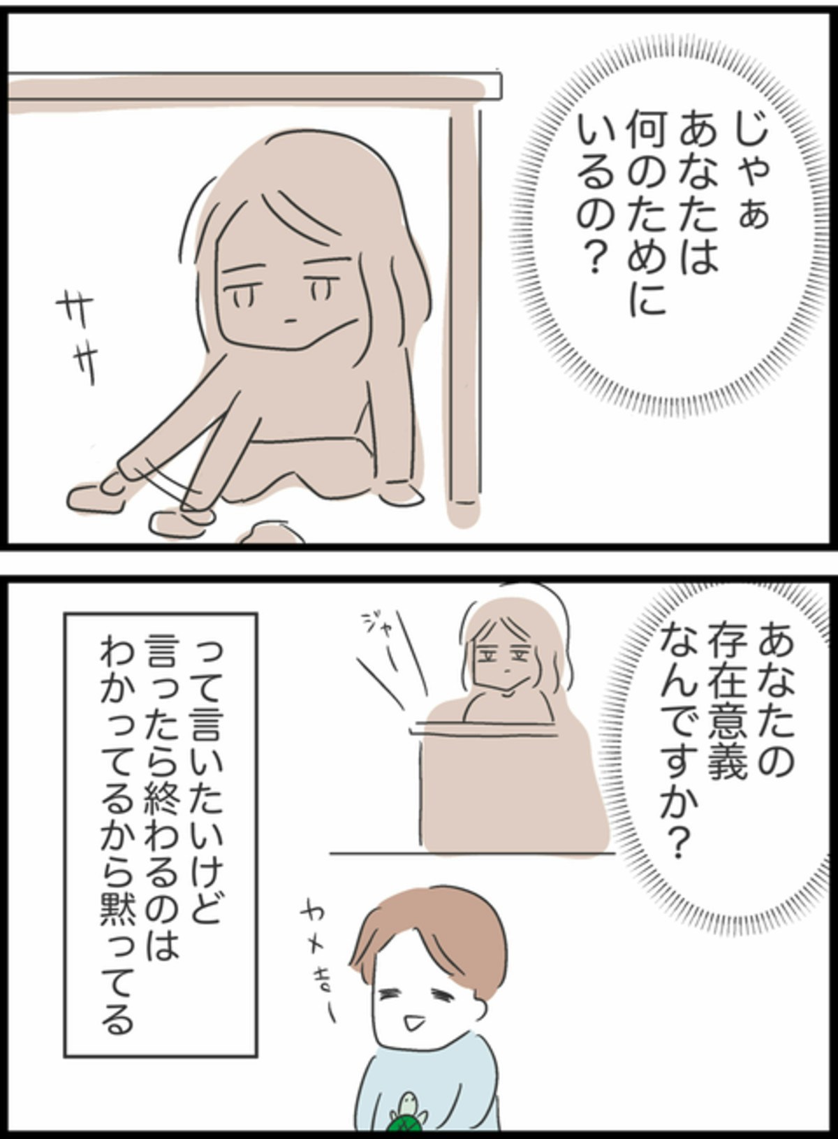 まったく家事育児に協力してくれないしょうた。呆れ果ててもう何も言えなくなったようこ。しょうたの存在意義まで疑問に思うようになってきてしまいました。