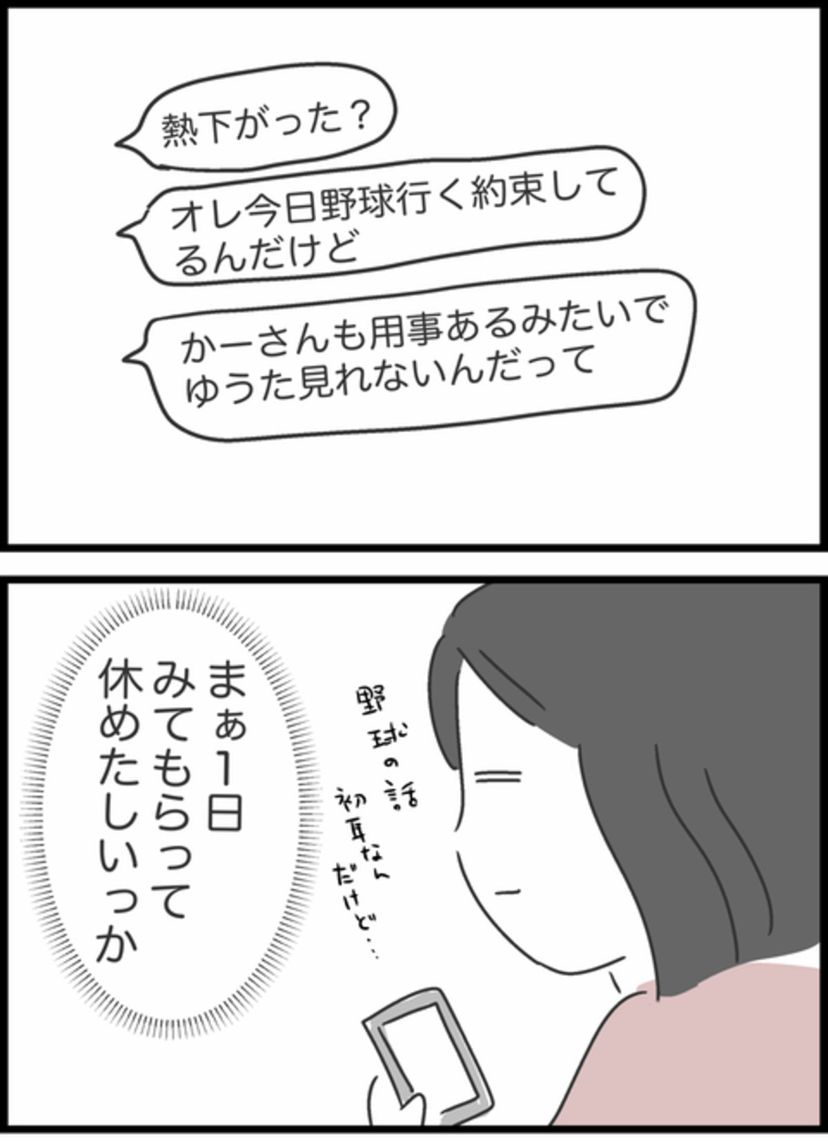 一晩1人でゆっくり休み、やっと熱が下がったようこ。しかし起きて早々、しょうたからのラインは鳴りやまず…。