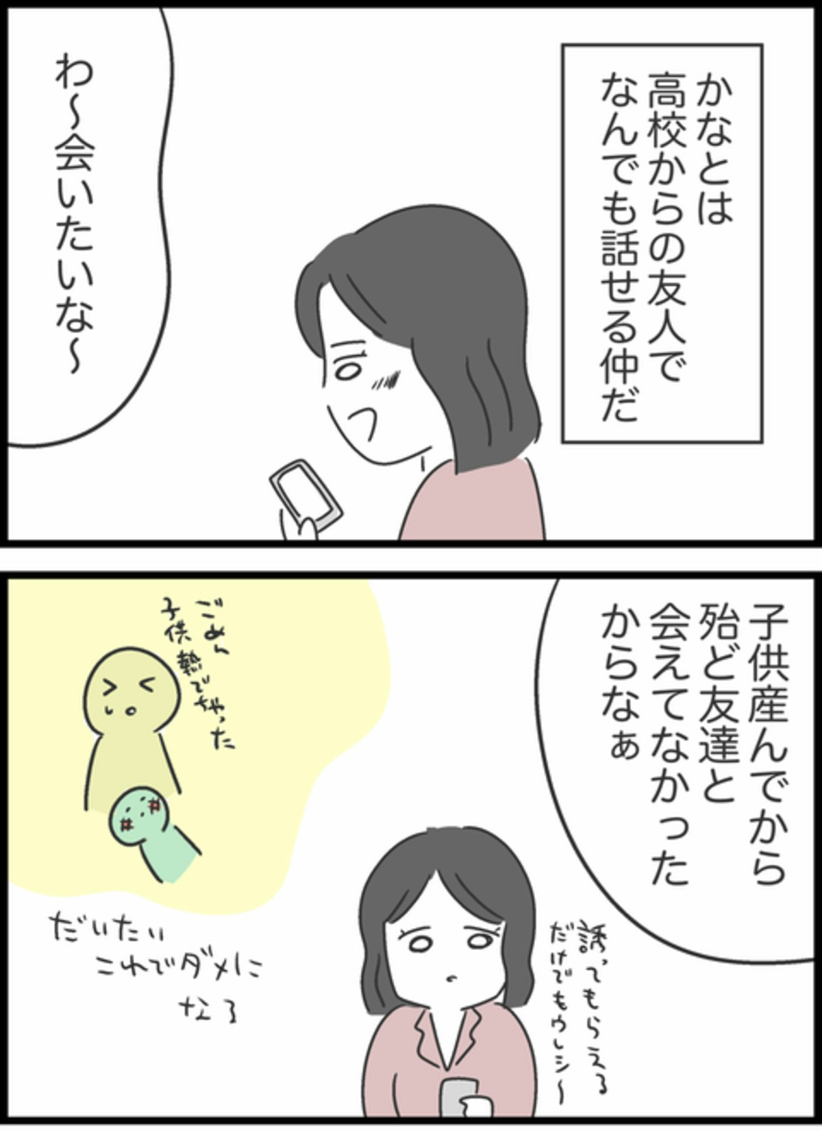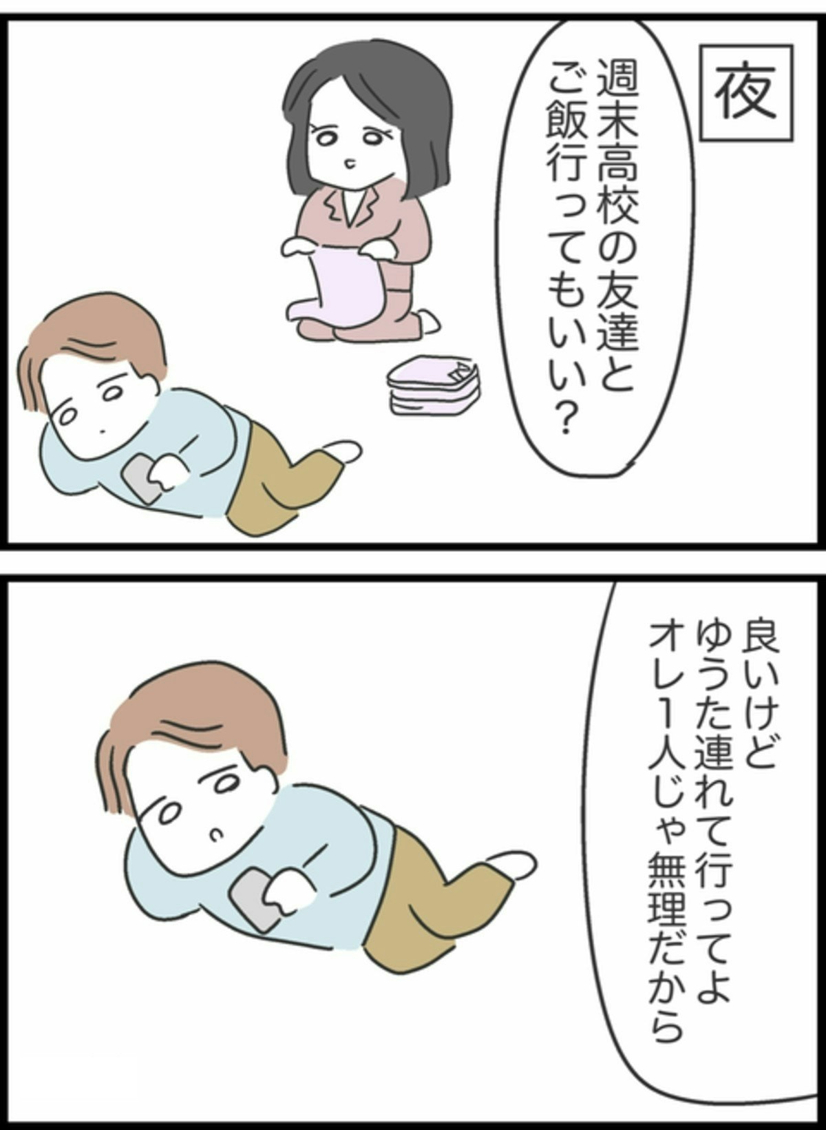 友達との約束に出かけて行ったしょうた。その日、ようこの高校時代の友人からお誘いラインがあり、しょうたに「週末高校の友人とご飯行ってもいい?」と聞くと…。