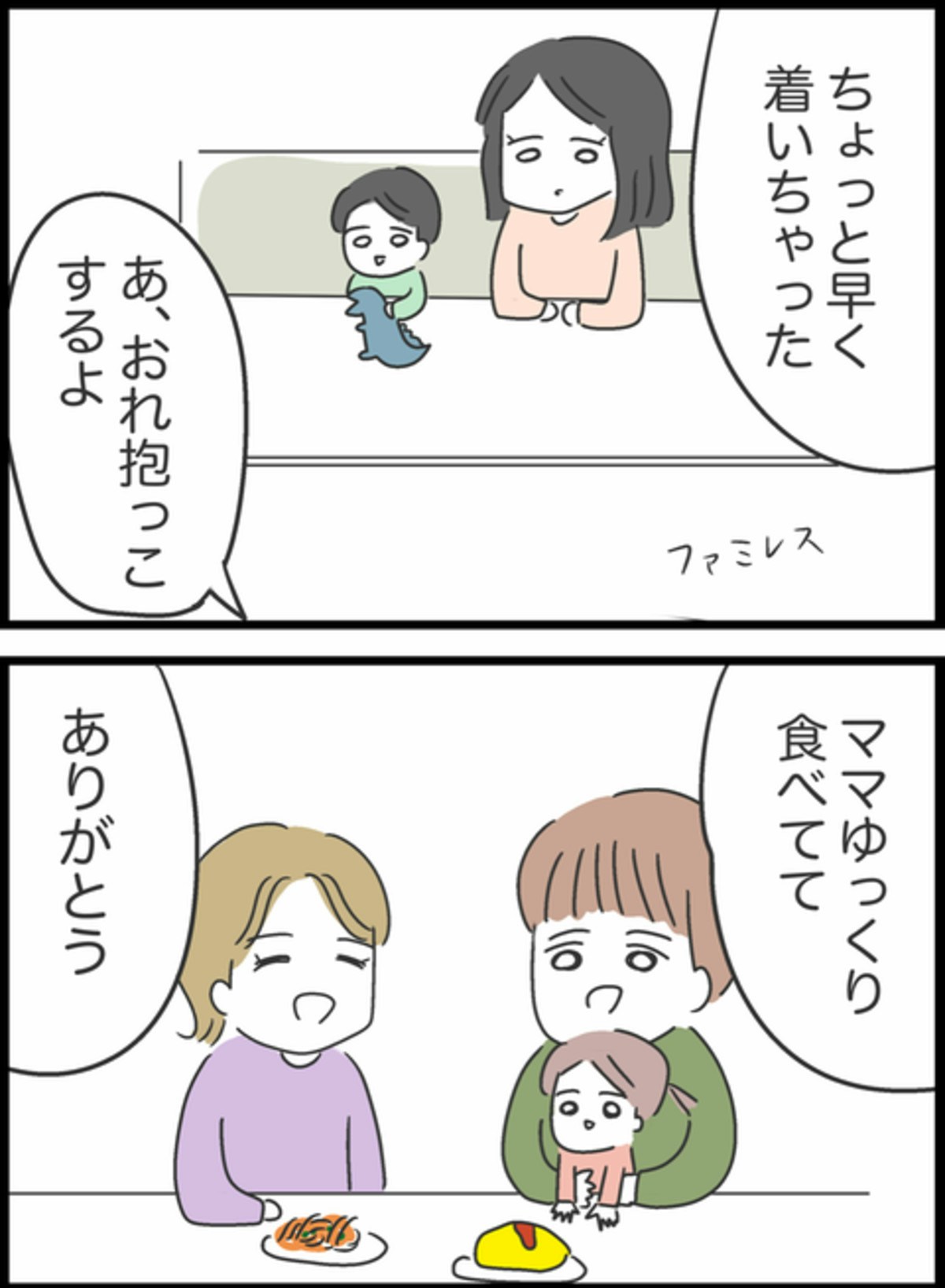 ちょっと早く着いてしまったようこは、近くに座っていた家族が目に留まりました。妻がゆっくり食べれるように旦那さんが子どもを抱いてくれている様子でした。こういう少しの気遣いでいいのに…。と羨ましい目で見つめるようこ。