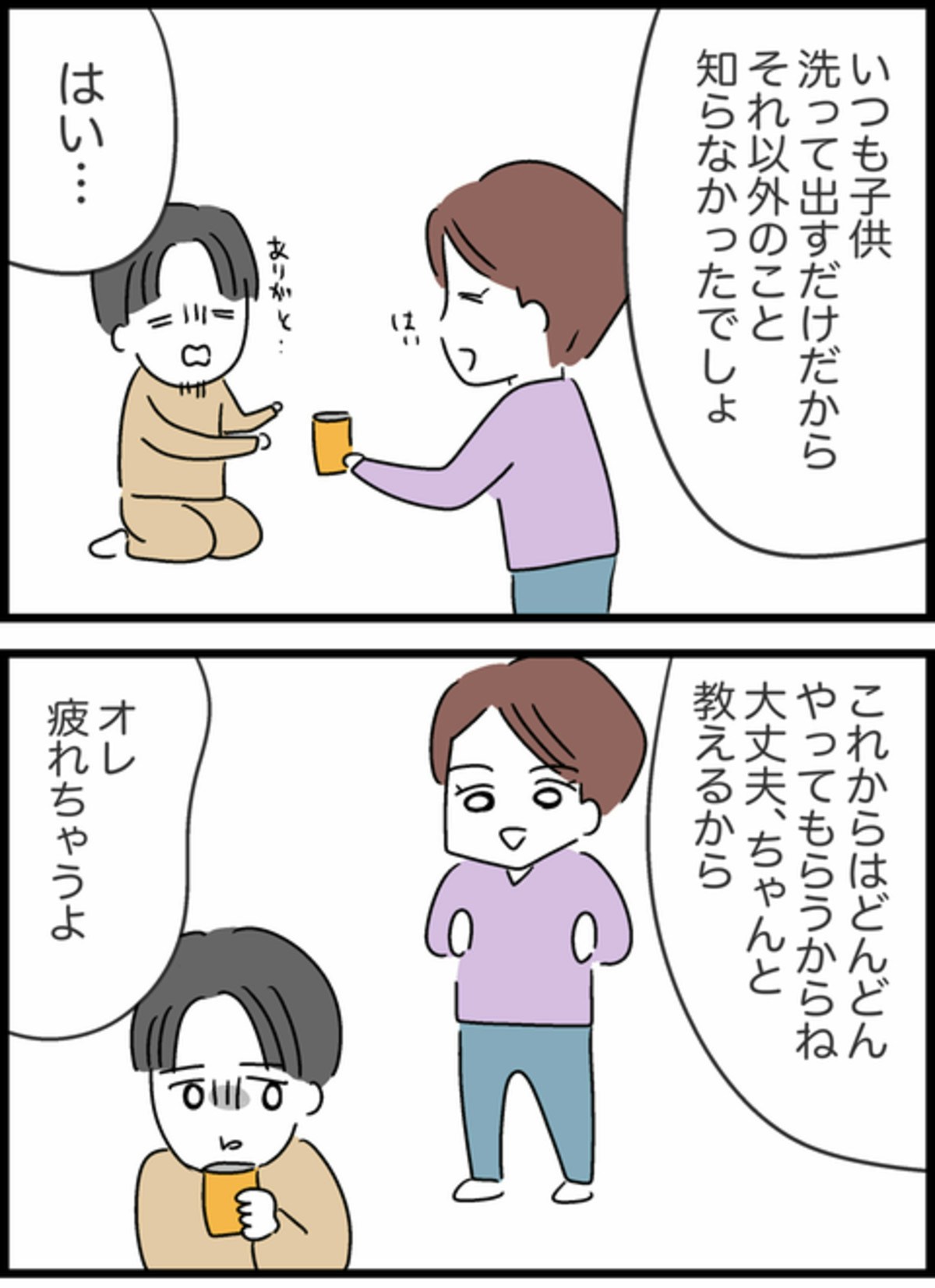 子どもをお風呂に入れ疲れた夫に、飲み物を差し出す妻。「これからはどんどんやってもらうからね」と言うと、夫は「オレ疲れちゃうよ」と驚きの言葉を発して…。