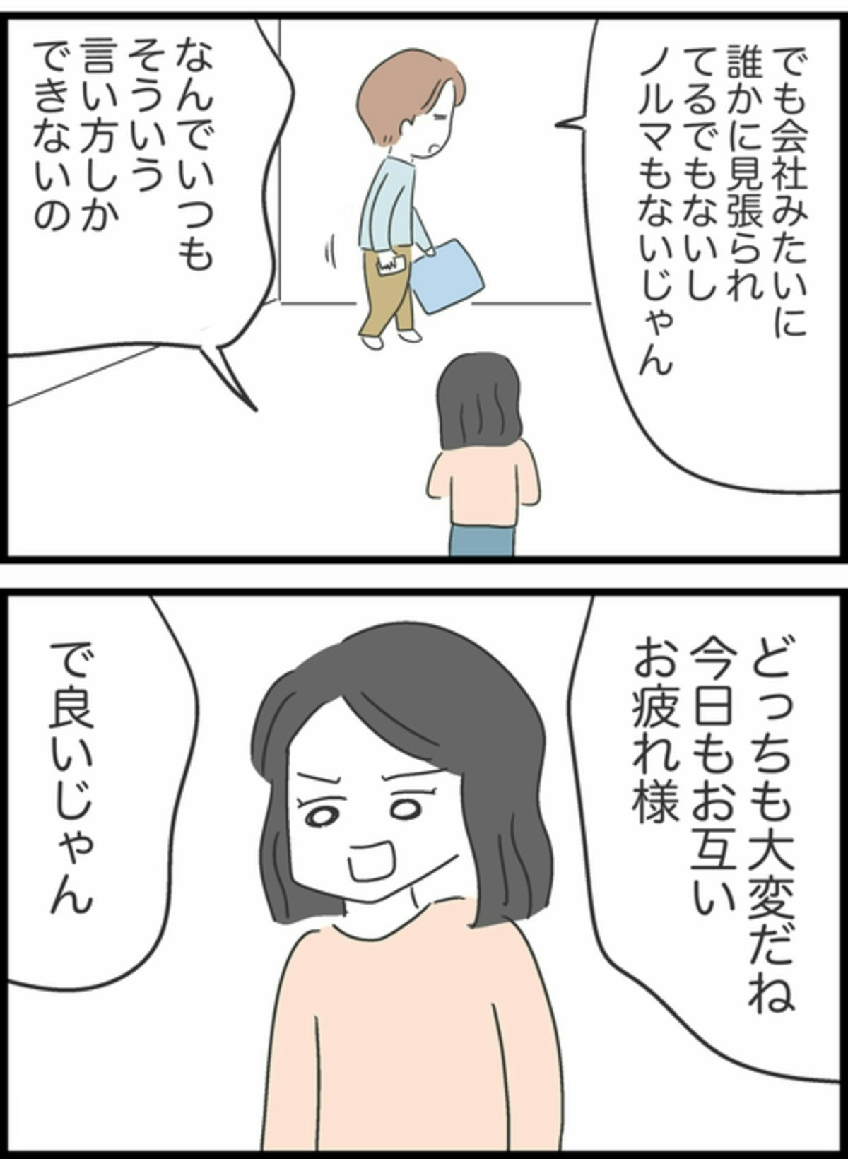 友人の話を聞いて、「うちも変われるかもしれない!」と希望を持ったようこ。帰宅後すぐに、夫・しょうたに「話したいことがある」と伝えました。しかし、しょうたは「疲れてるのに…」と乗り気ではなく専業主婦で家にいるようこと、外で働く自分を比較して、「会社で働く方が大変だ」とマウントを取ってきたのです。
