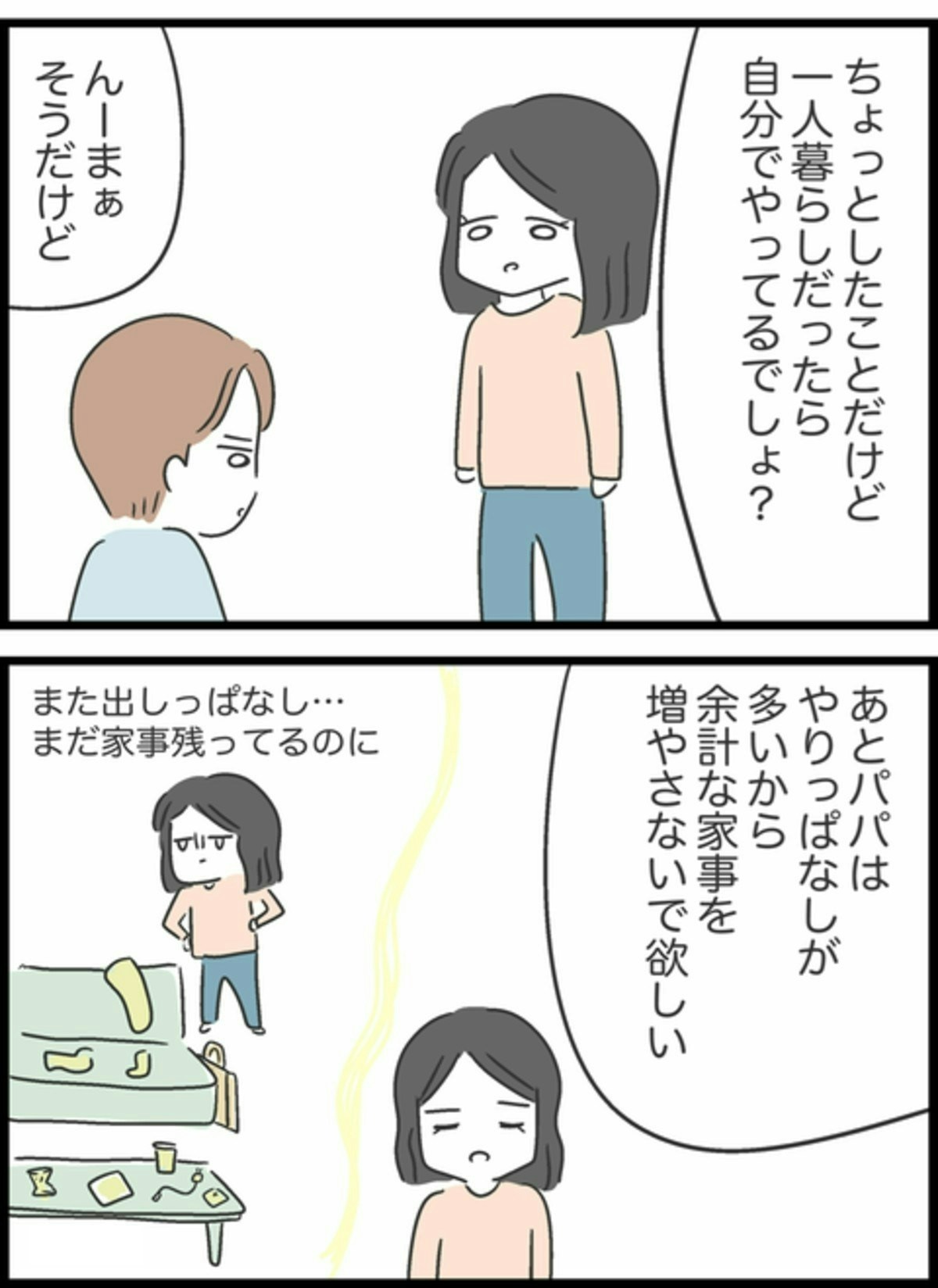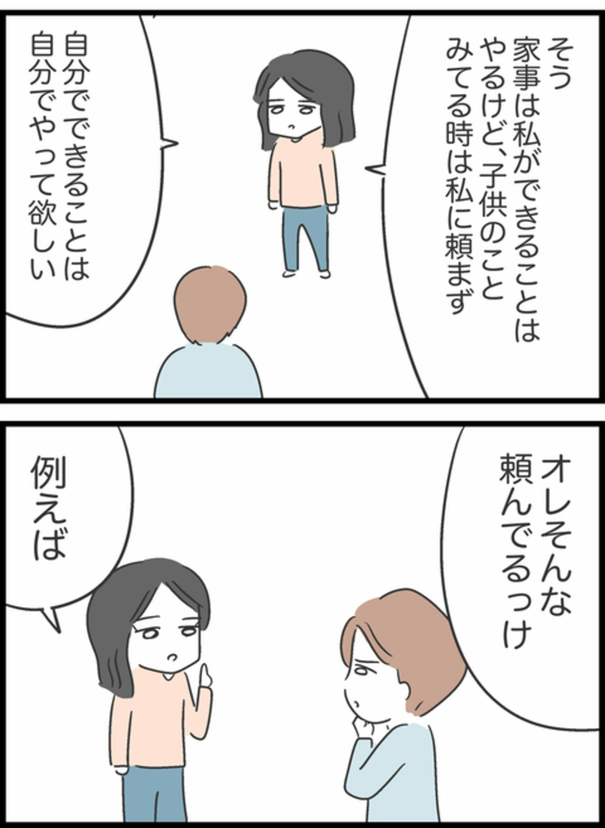「疲れてるって言葉で問題から逃げるのはやめて」としょうたを非難したようこ。「自分でできることは自分でやってほしい」とようこが言うと、自覚のないしょうたは「オレそんな頼んでるっけ」と言って…。