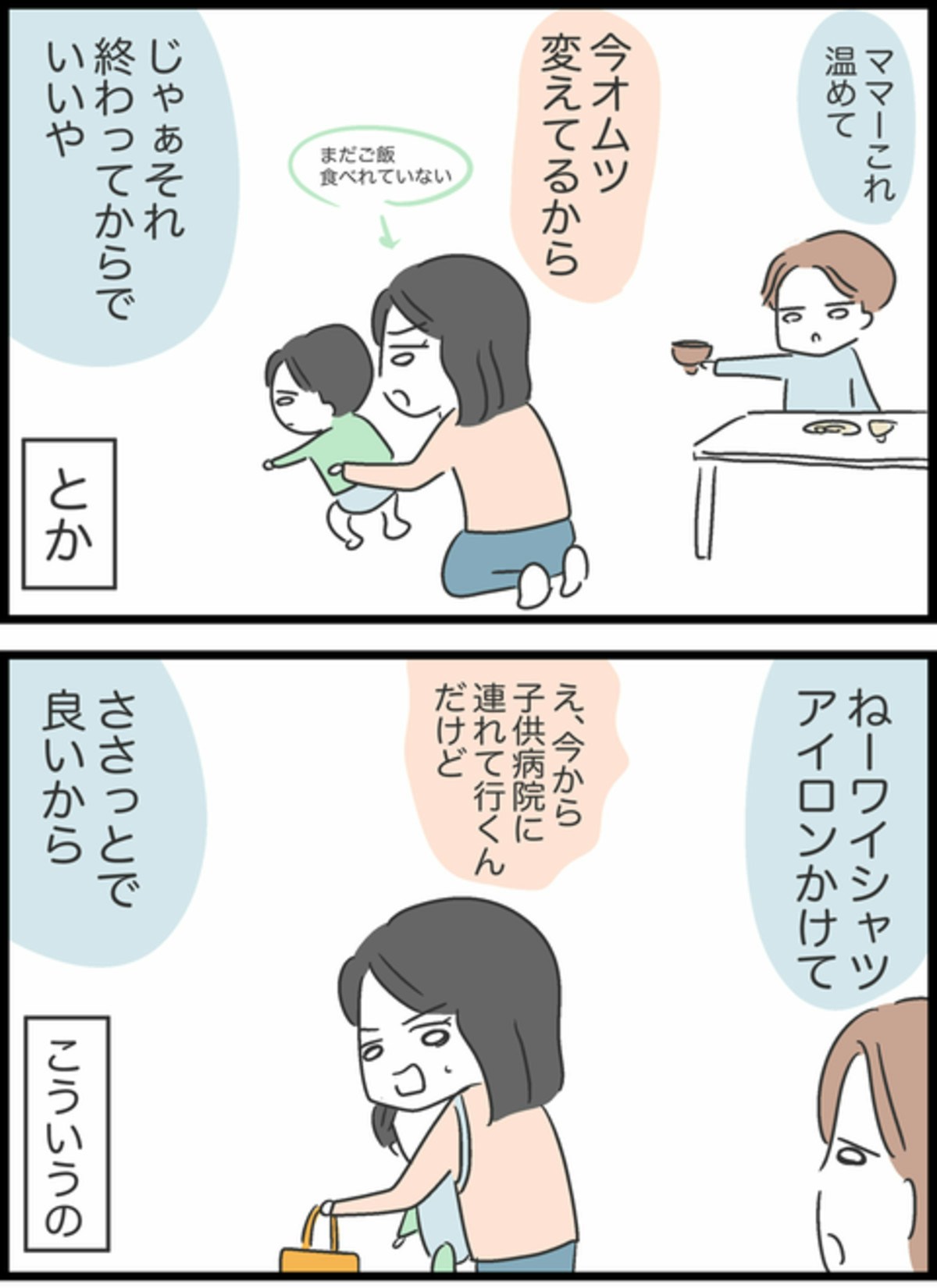 子育てで忙しい時に、「ご飯を温めて」だの「アイロンかけて」だの言われたら腹が立ちますよね。それくらい自分でやって!というようこの気持ちが痛いほどわかります。