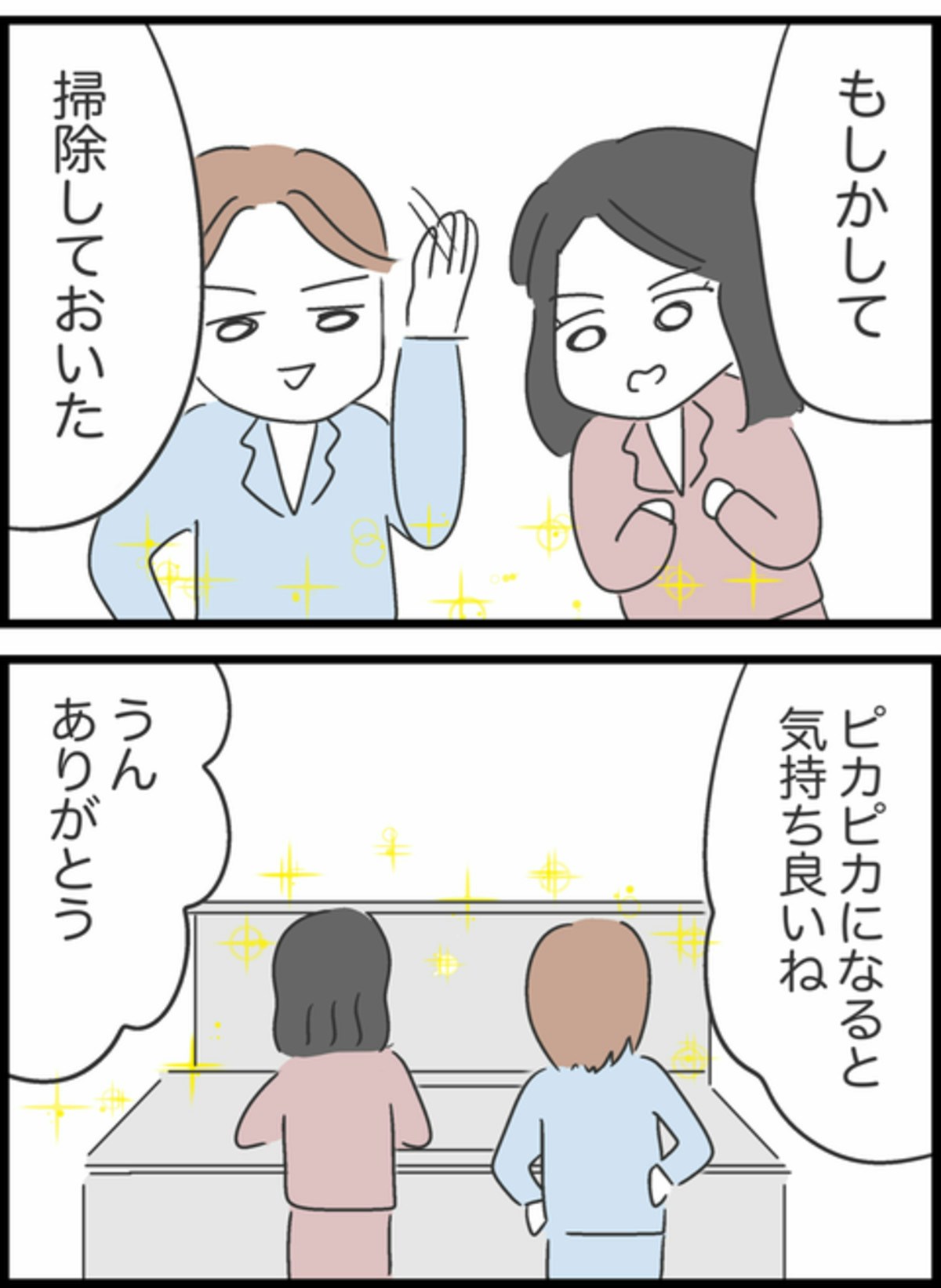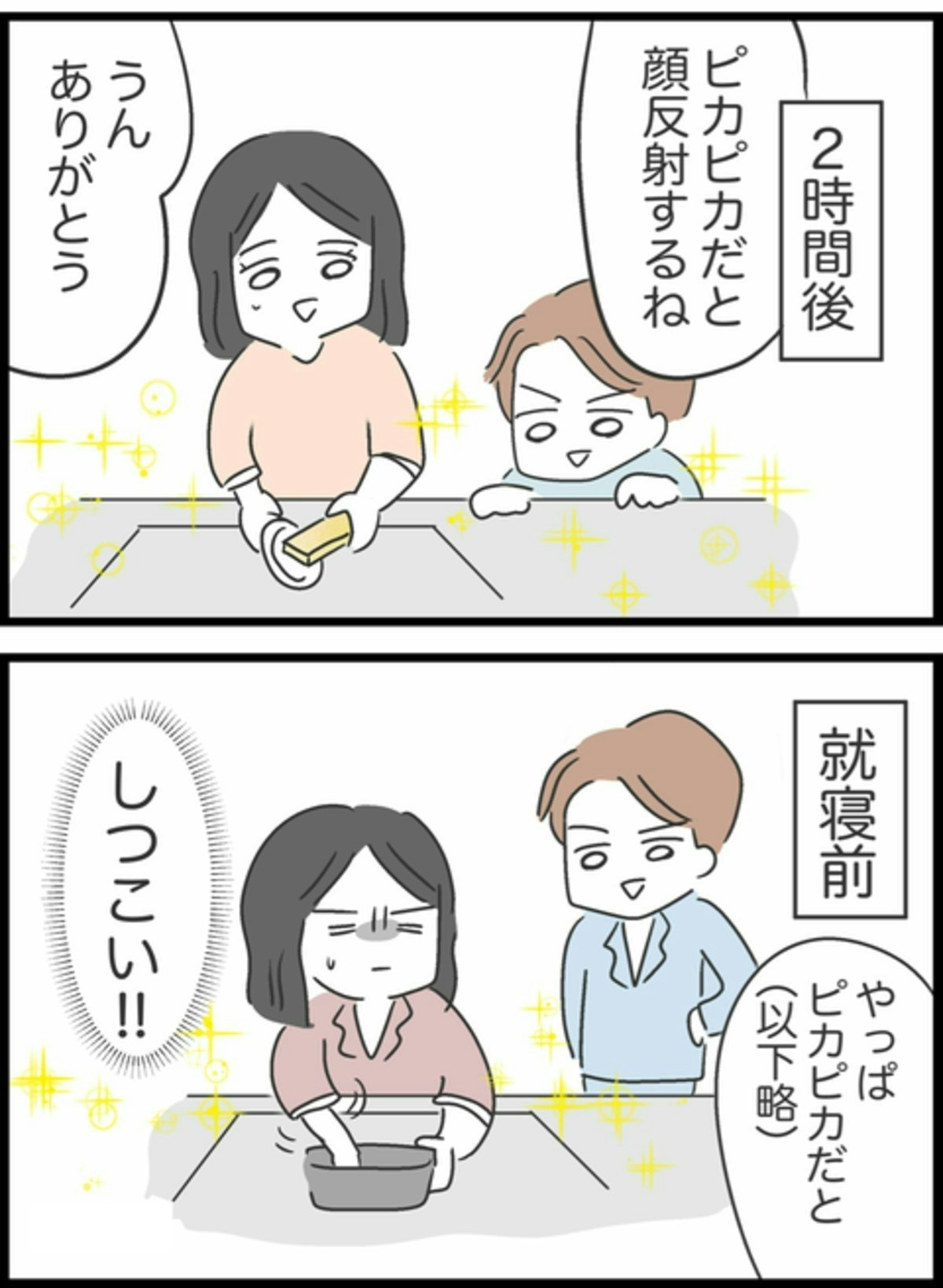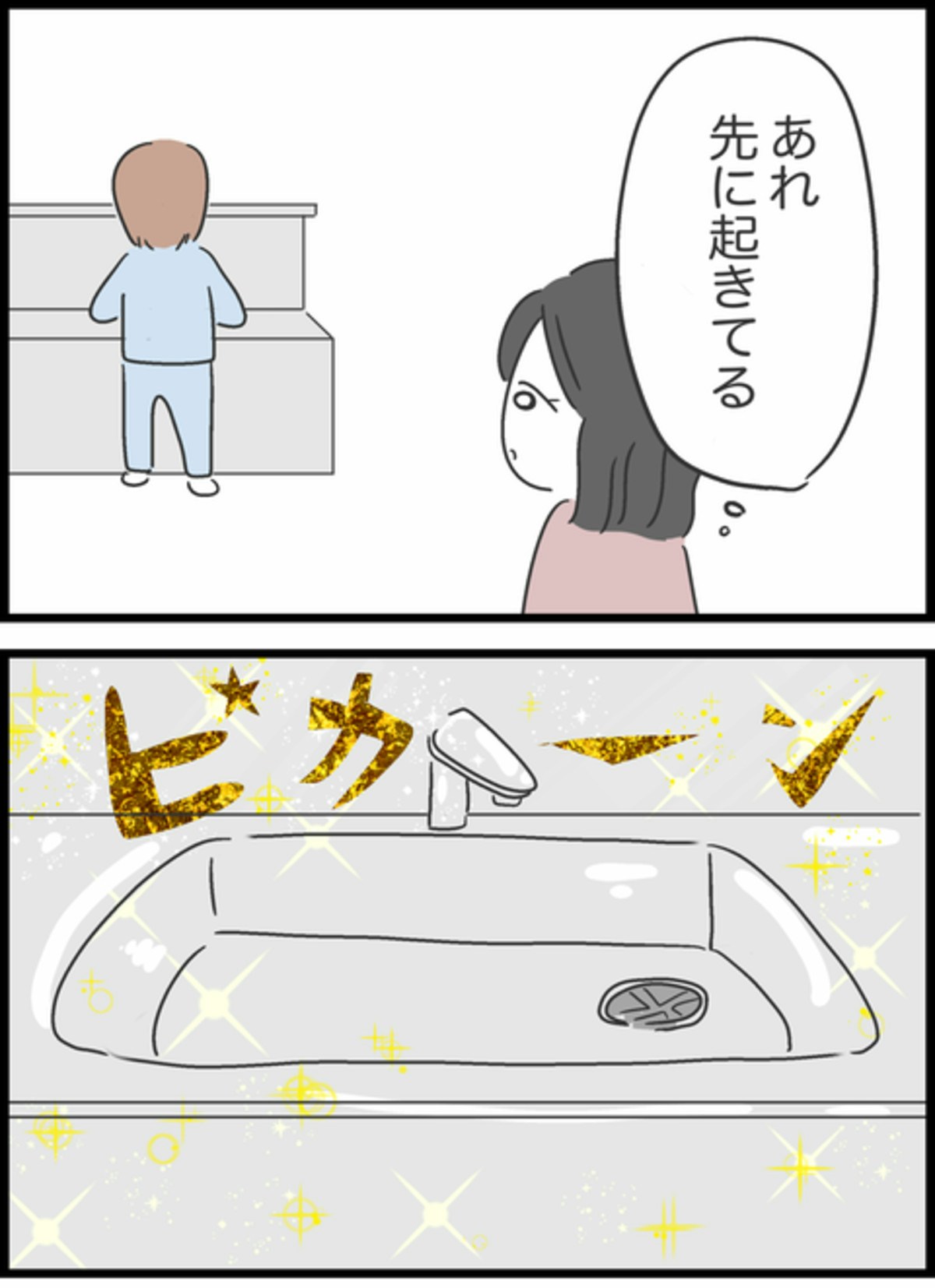 翌朝ようこが起きると、そこにはピカピカになったシンクが。そして「掃除しておいた」とドヤ顔のしょうた。昨日言ったことで早速効果があったのか!と喜ぶようこでしたが…。