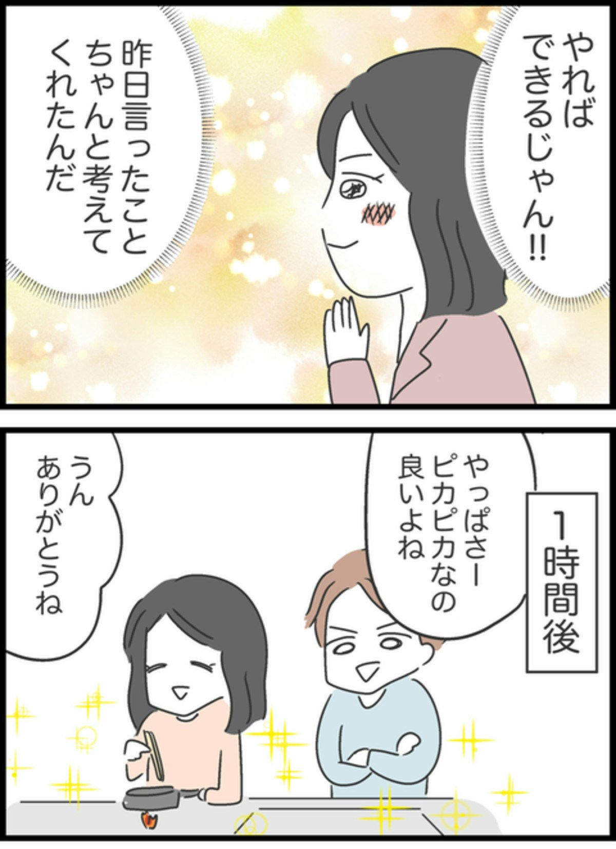 ようこが朝起きると、しょうたがキッチンに立っているではありませんか!!なんとキッチンシンクがピカピカに。全然伝わっていないとガッカリした翌日に、こんなことが起こるなんて…。このまましょうたは継続してくれるのでしょうか。