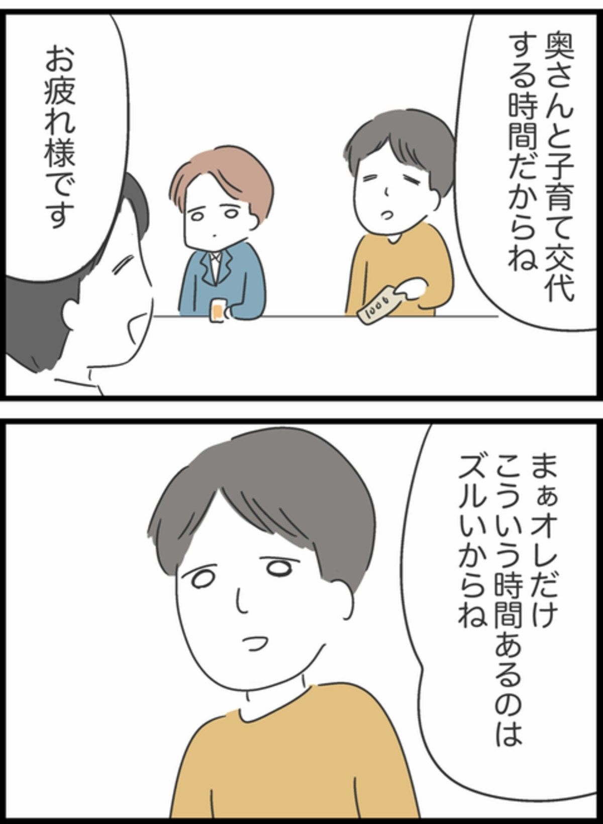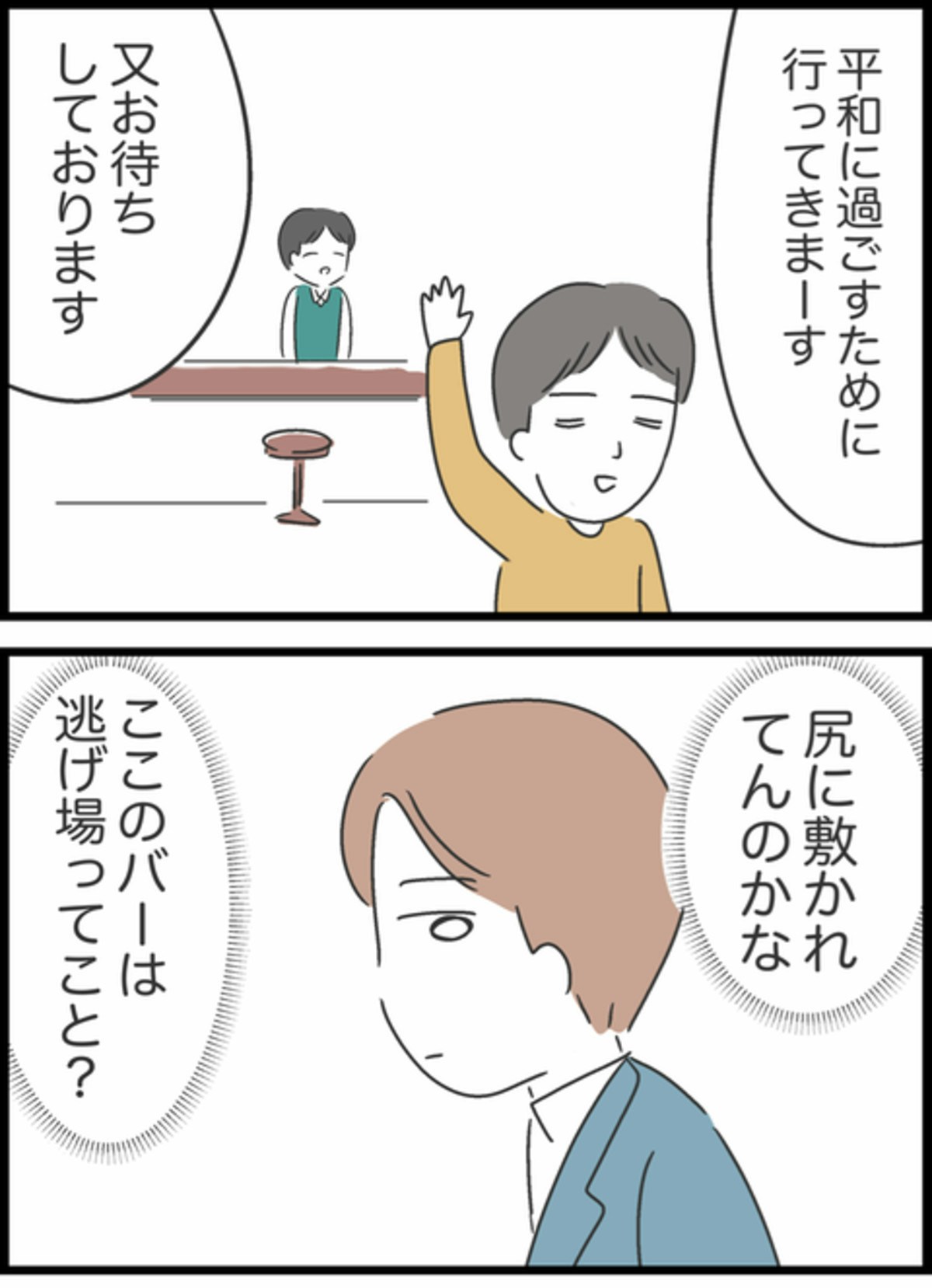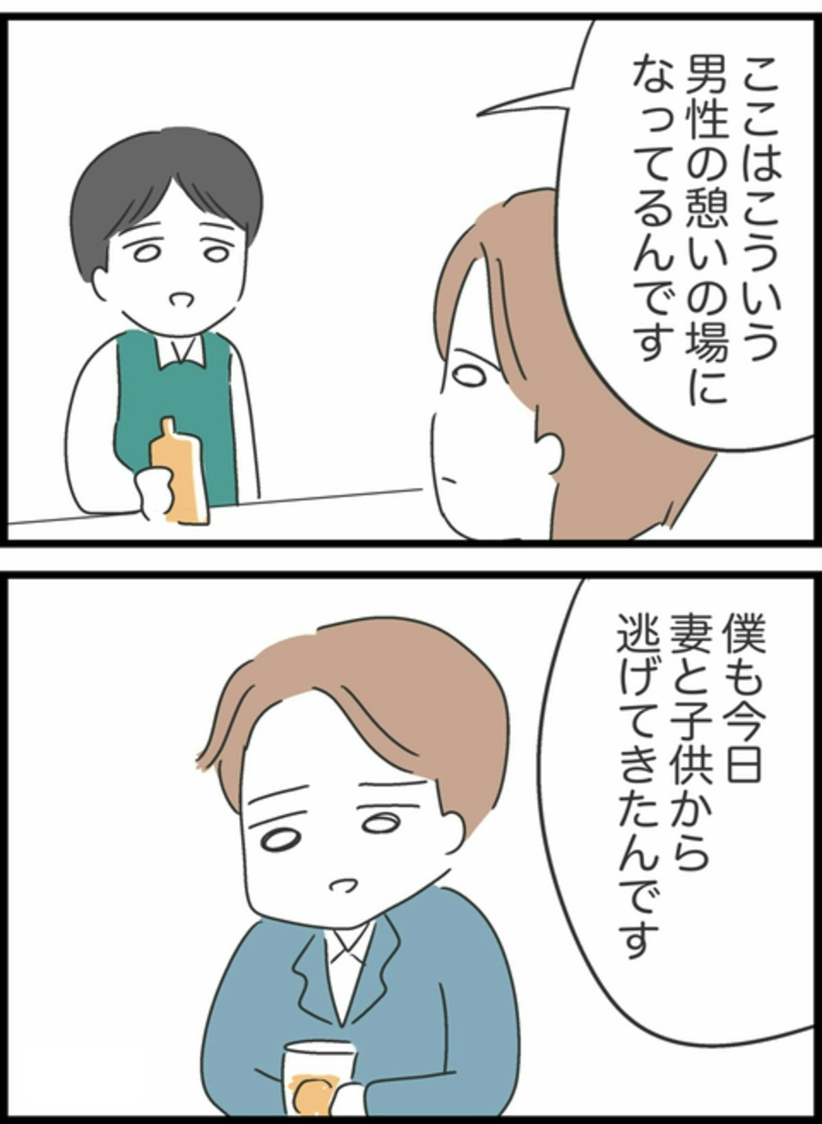 しょうたはフラッとBarに寄ると、なぜかそこには1人の男性ばかり…。すると1人の男性が奥さんと子育て交換の時間だからと席を立ちました。それを見てしょうたは?