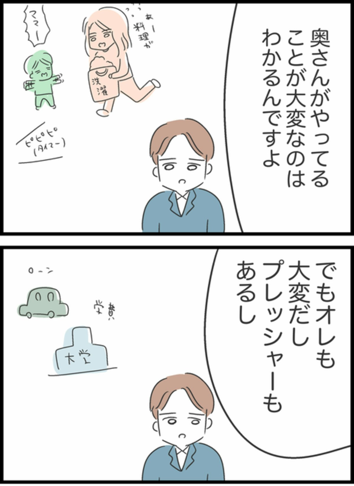 主人公・ようこもその1人。専業主婦として家事も育児もひとりで背負う日々のなかで、夫・しょうたが非協力的であることに、少しずつストレスが募っていきます。「こんなはずじゃなかった」と思う毎日。何度気持ちを伝えても変わらない夫の姿に、「離婚するか、自分が折れるか」と、極端な選択肢に心が傾いていきます。