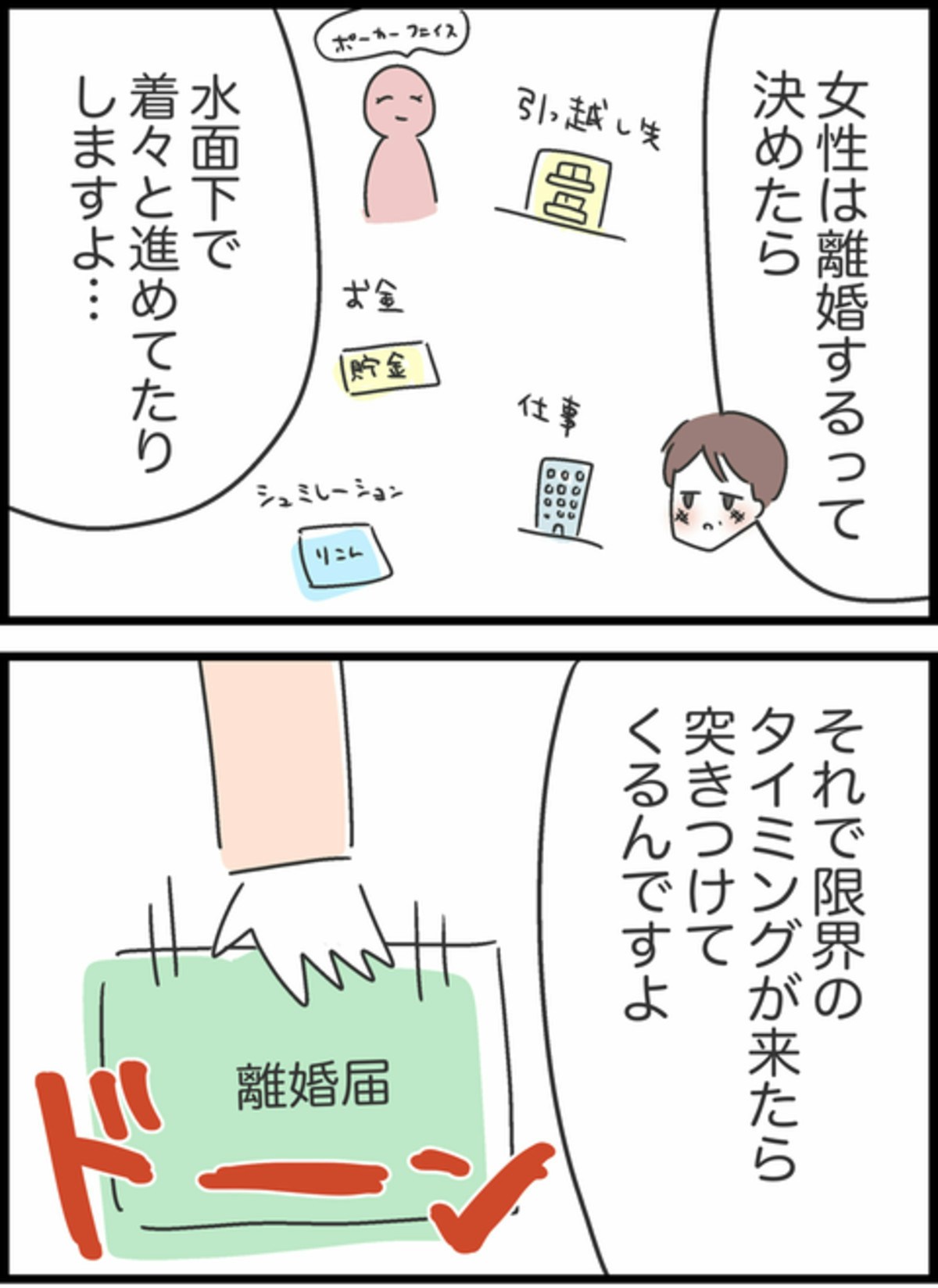 ようこの気持ちを理解しようと歩み寄るしょうた。そしてようこも、少しずつ相手を信じ直す努力を重ね、今では落ち着いた日々を取り戻しつつあります。ただ、ようこの引き出しには今も離婚届が残されています。それは、自分の気持ちに嘘をつかないための「お守り」だそうです。