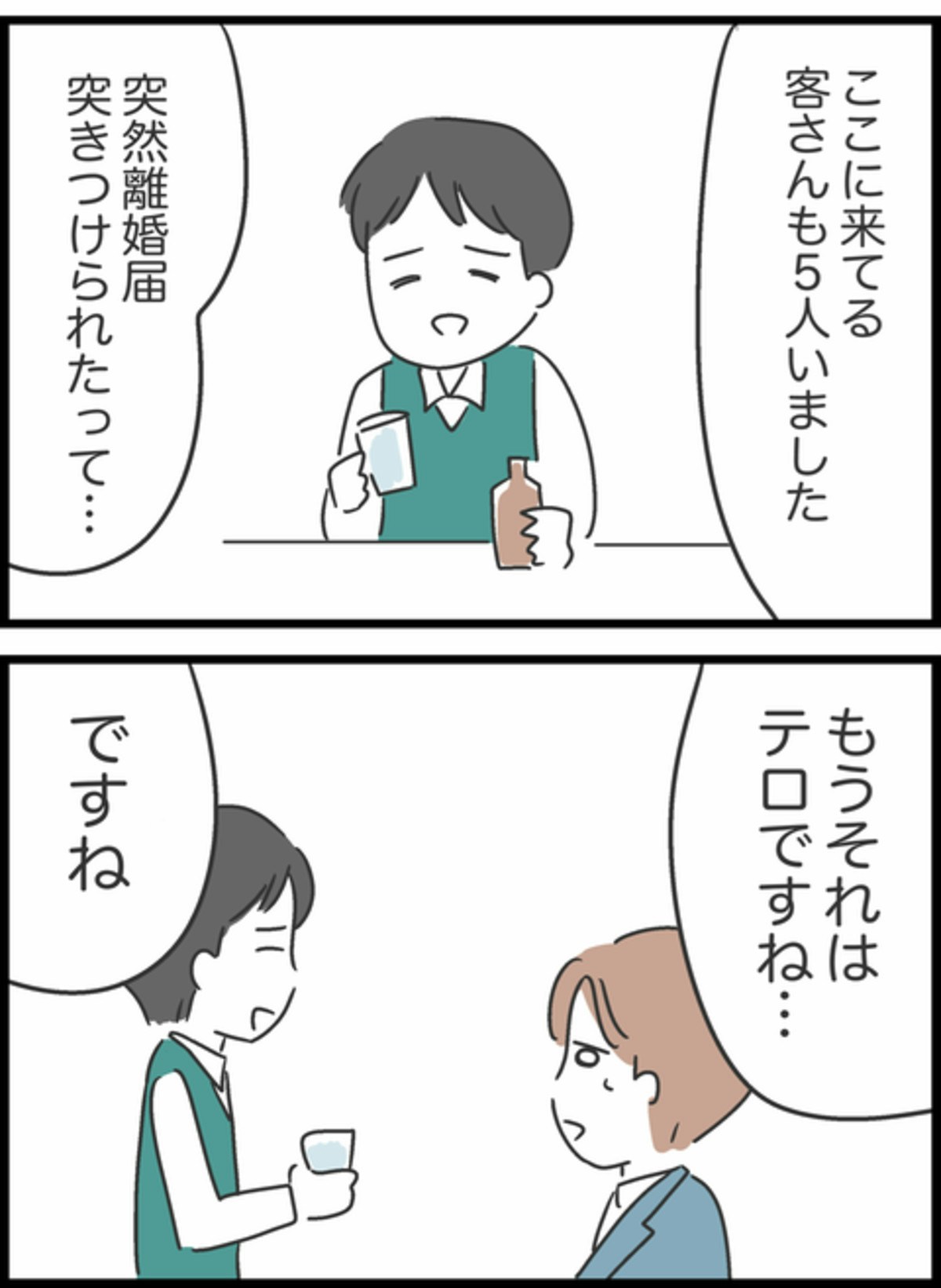 「女性は水面下で着々と進めて、タイミングが来たら離婚届けを突きつけてくる」と話す男性。するとバーの店員が「ここに来てるお客さんも、離婚届けを突然突き付けられた人が5人いました」と教えてくれ…。