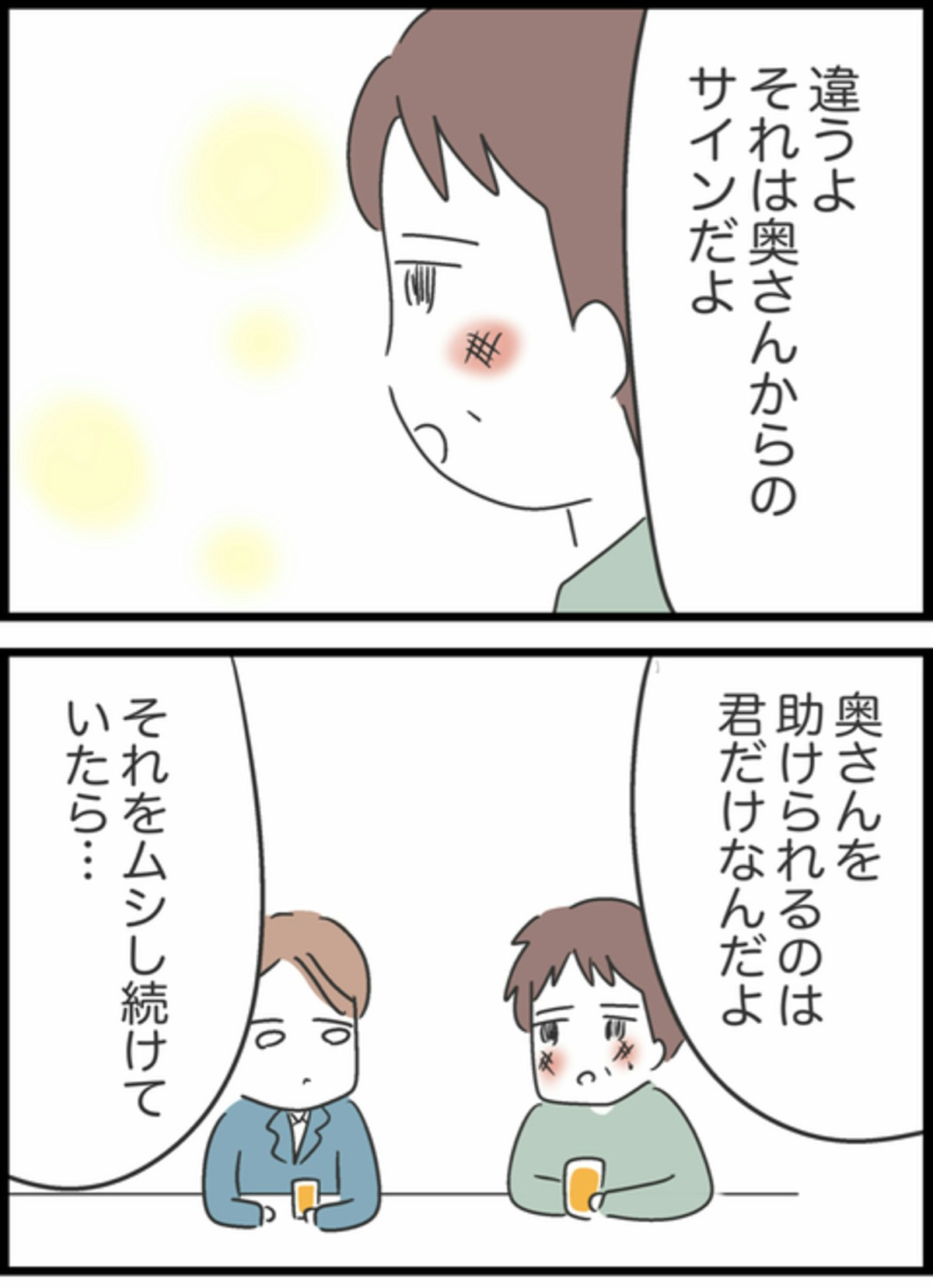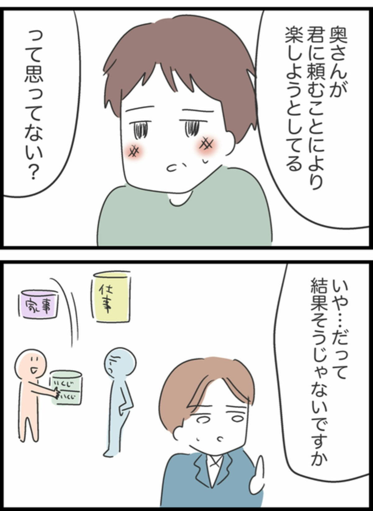 しょうたに対し「意固地になってる気がするなぁ」と言った男性。さらに「奥さんが君に頼むことにより、楽しようとしてるって思ってない?」と言い…。