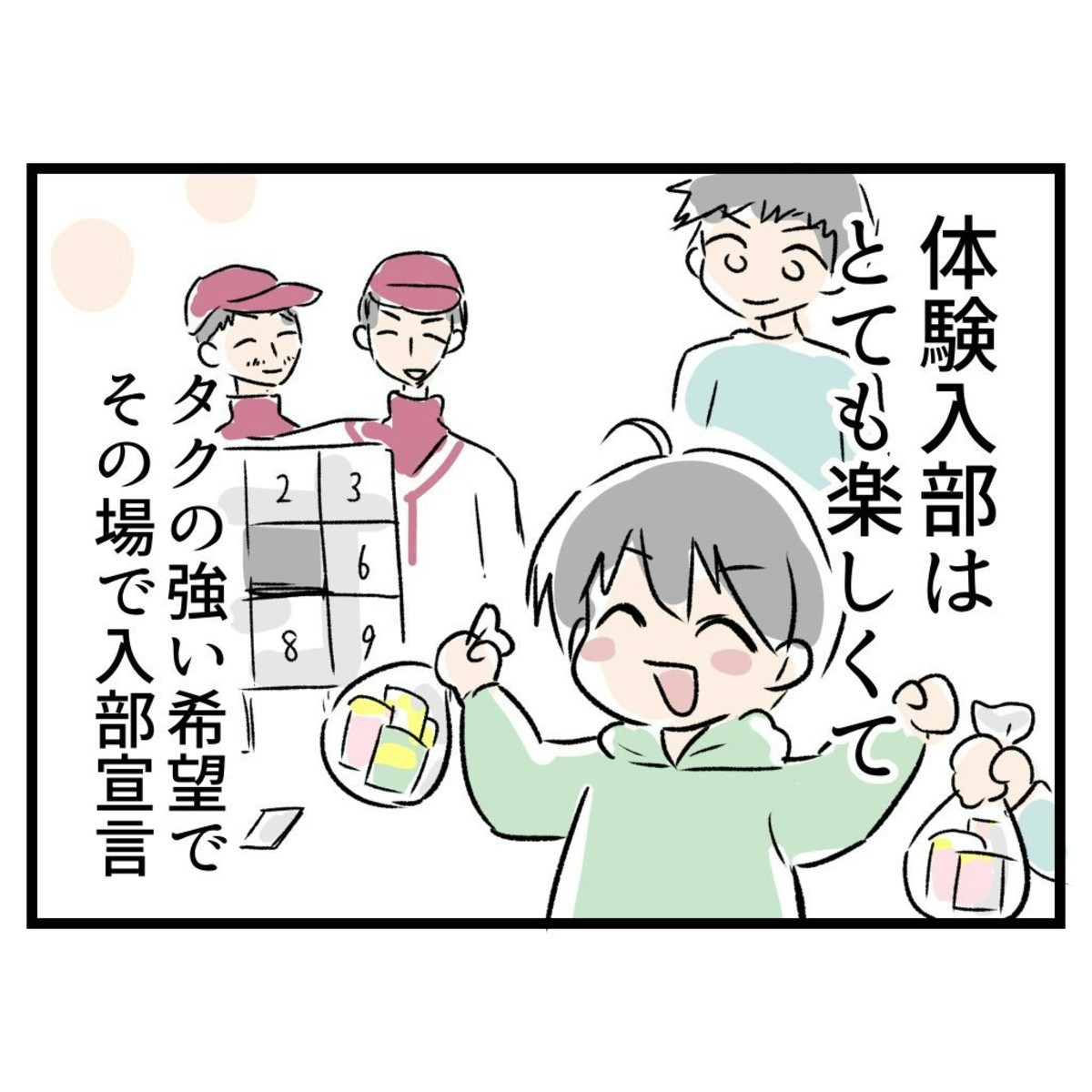 そろそろ習い事を始めようかと考えていた就学前の春休み、主人公のもっつんさんは保育園に貼ってあったチラシを見て、息子を野球の体験入部に連れていきます。