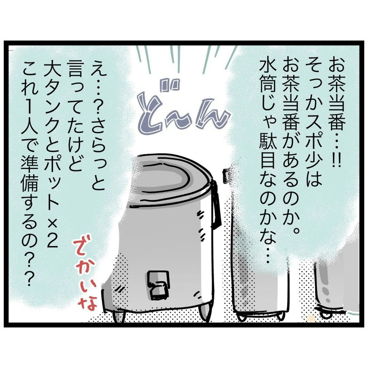 お茶当番は、大きなタンクとポット二つ分の飲み物と氷を準備しなければいけません。そのボリュームに、もっつんさんは困惑します。