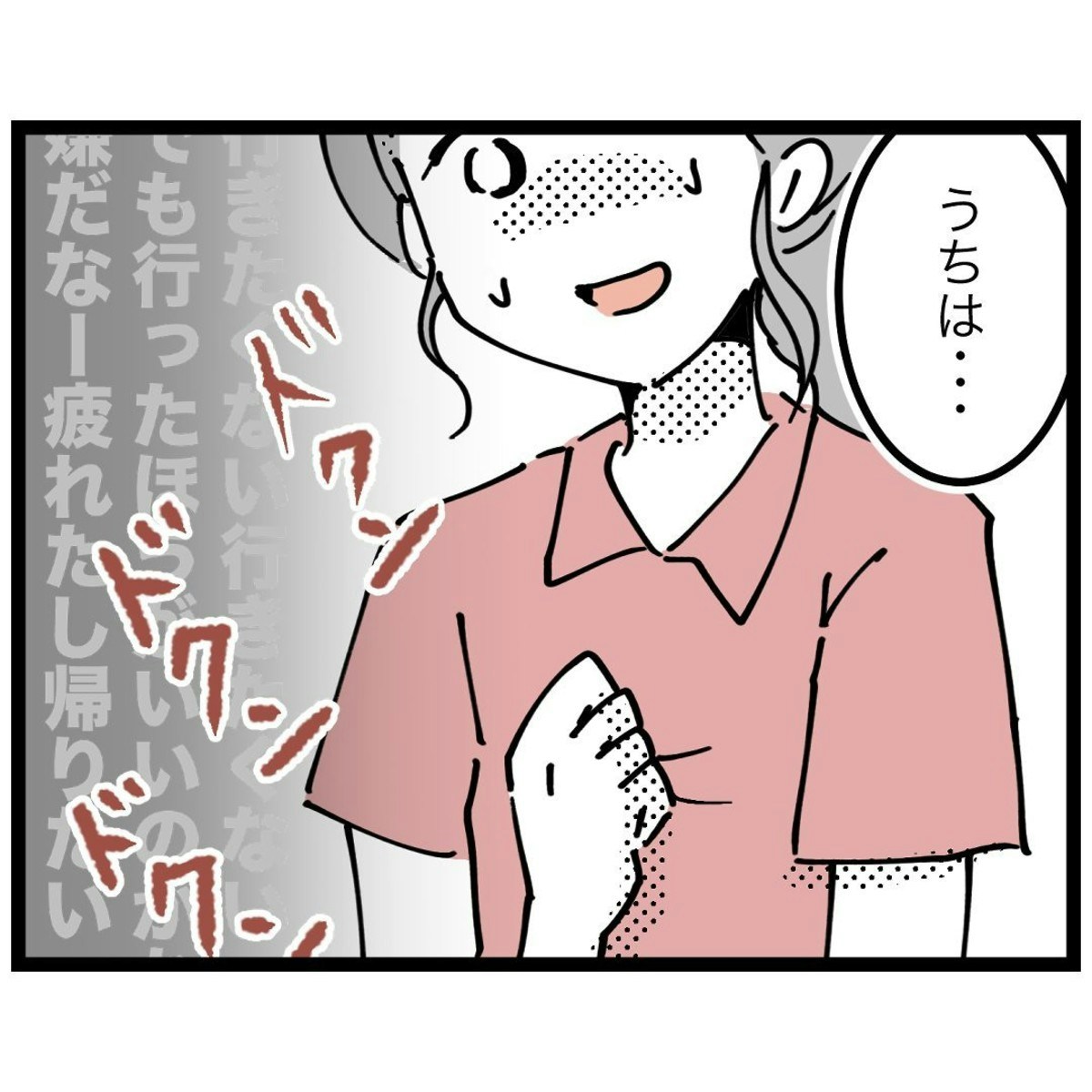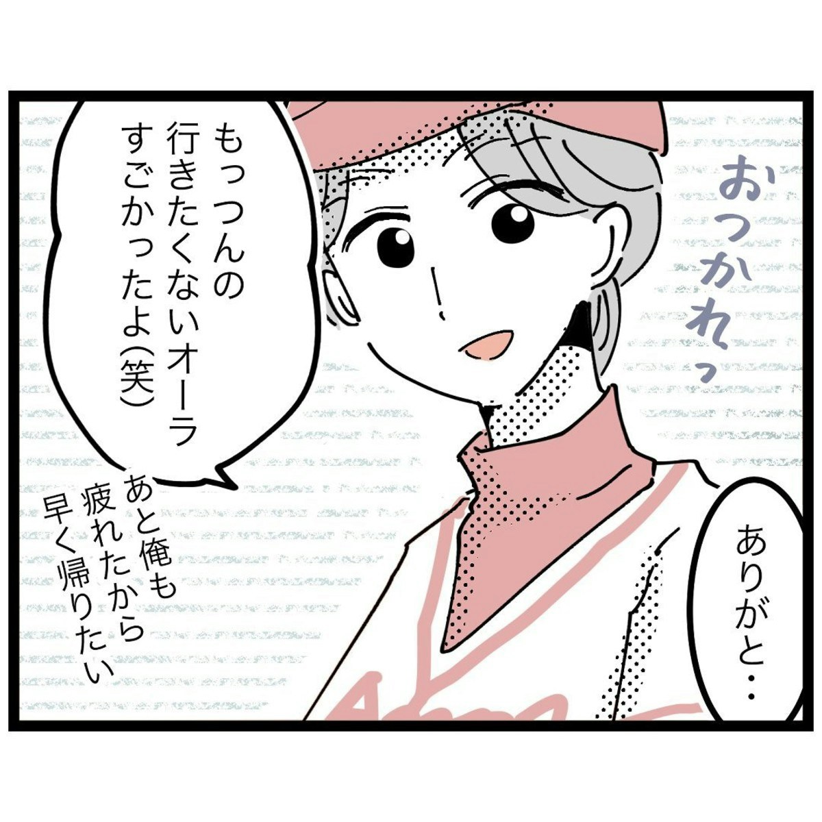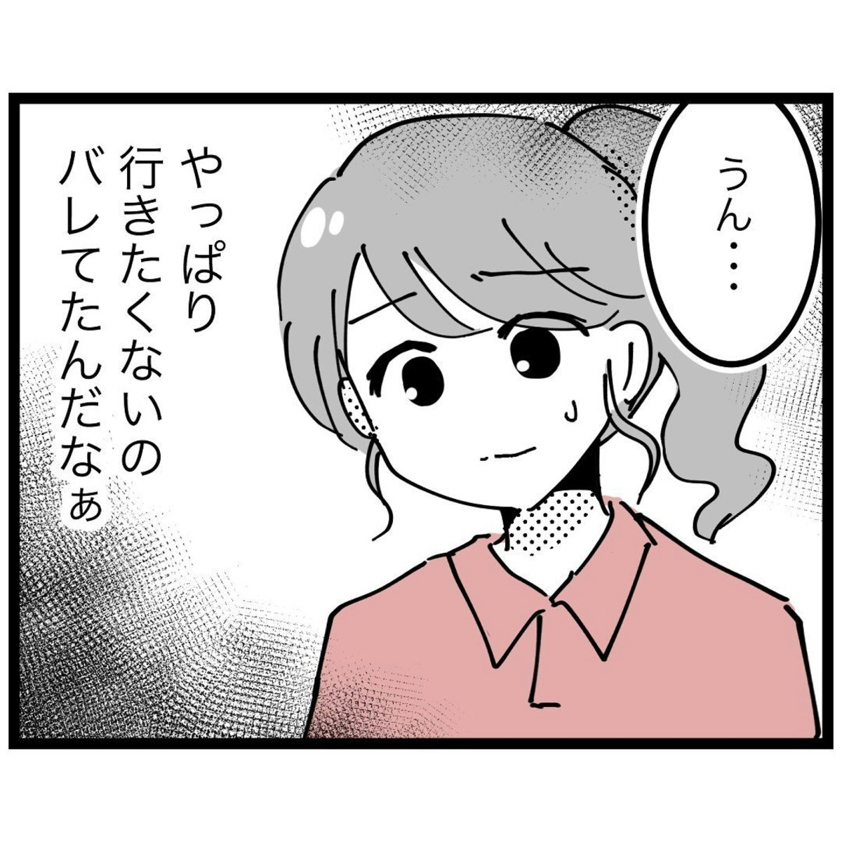 夫の助け舟で、打ち上げには行かないことになりました。「行きたくないオーラ」が出てしまっていたことに、もっつんさんは複雑そう。