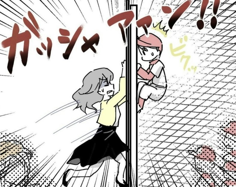 スポ少野球の練習中、フェンスによじ登る息子・タク。周囲は騒ぎになっています。