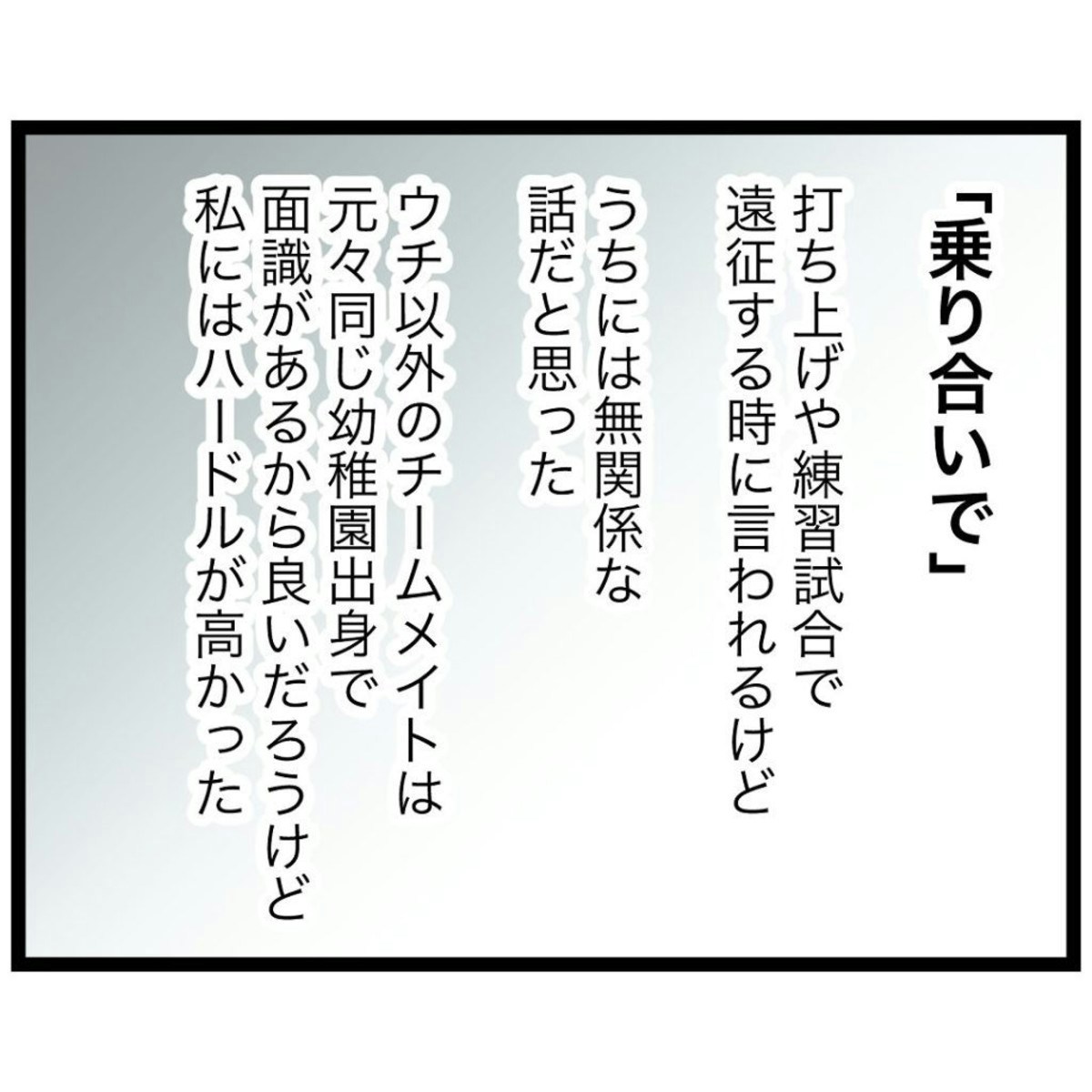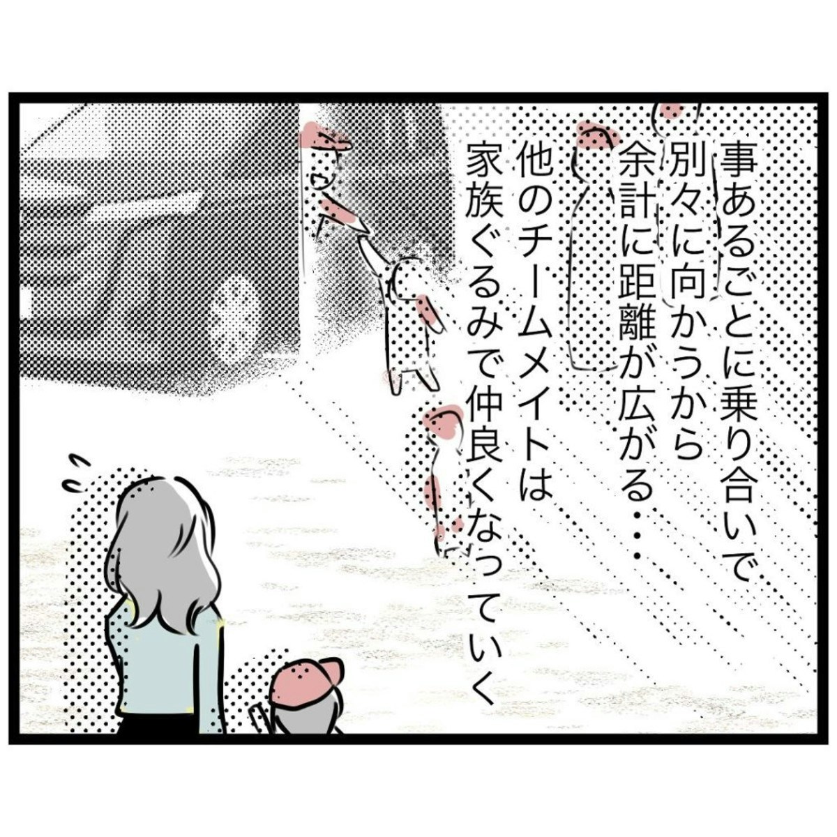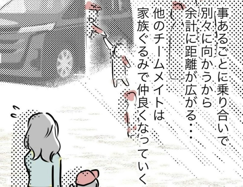 遠征や打ち上げを乗り合いで移動するのが当たり前の、仲の良い保護者たちに囲まれ、もっつんさんはますます輪に入れず、孤独を感じていました。