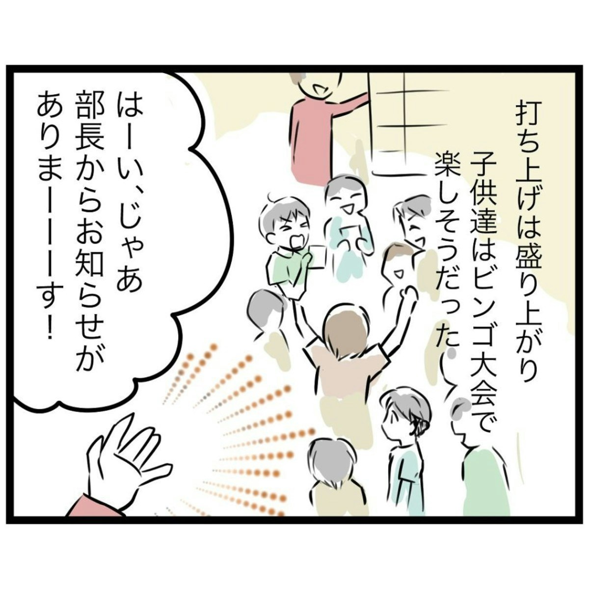 子どもたちはビンゴで盛り上がり、打ち上げを楽しんでいます。そして部長から発表された、登山訓練。恒例行事のようですが、もっつんさんは初耳です。