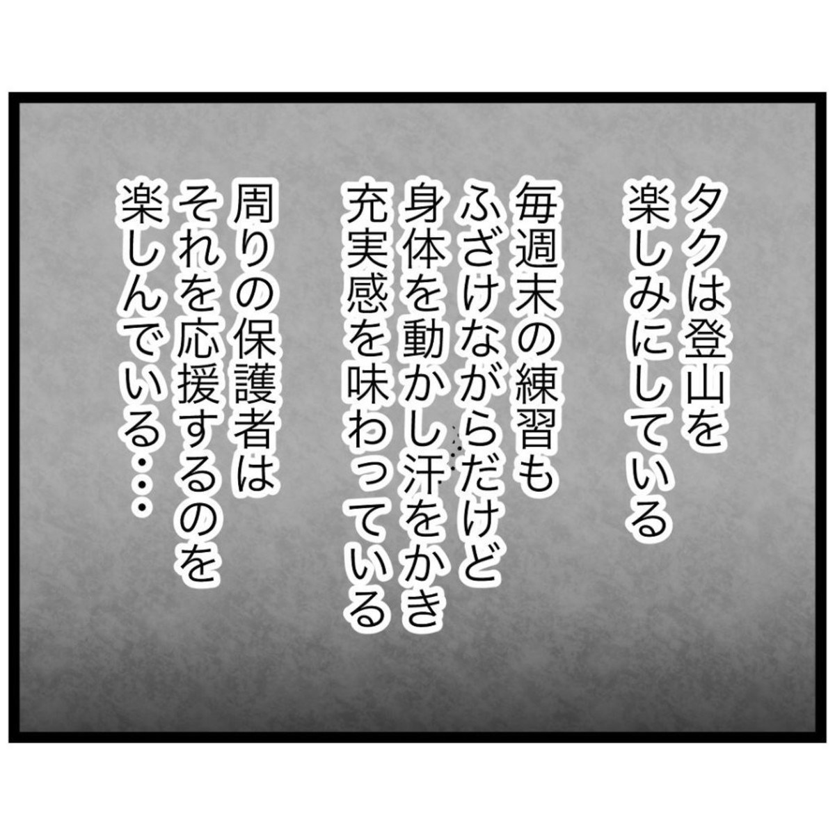 スポ少で登山訓練があることを知らされ、父親同伴が暗黙のルールのような雰囲気に。けれども休日出勤が多い夫は期待できず、もっつんさんが頑張るしかない状況に気が重くなります。一方で息子のタクは、登山を楽しみにワクワクしていました。