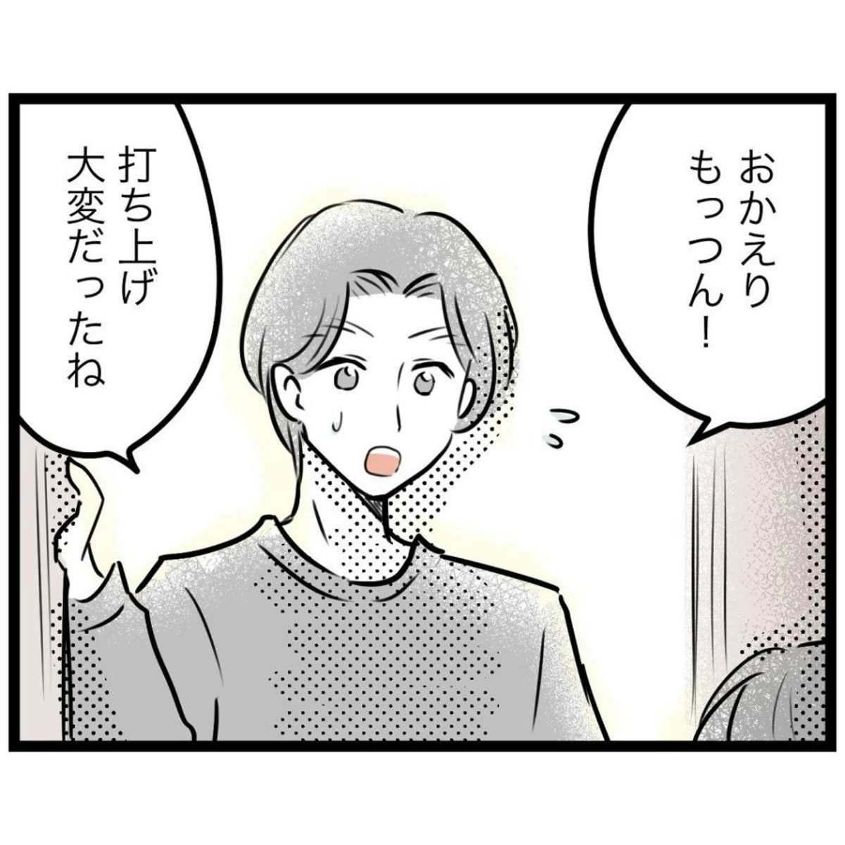 チームの打ち上げに参加し、気疲れして帰宅したもっつんさん。慣れない飲み会の空気にぐったりする彼女の様子を見て、夫は心配の眼差しを向けていました。