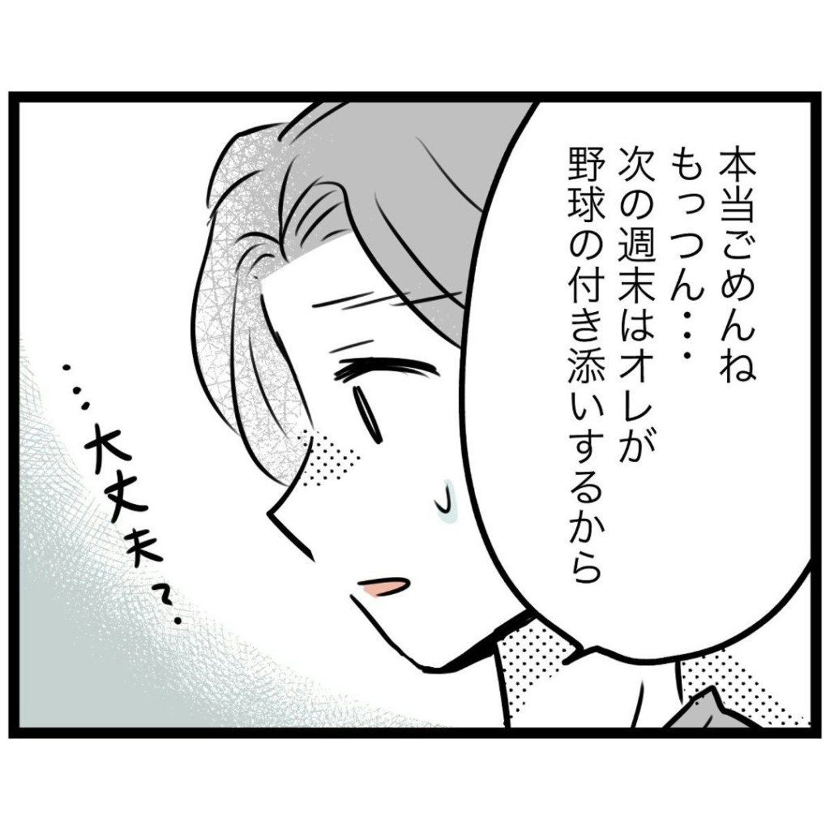 居心地の悪いスポ少野球の打ち上げから、疲労困憊で帰ってきたもっつんさんを、夫が出迎えます。