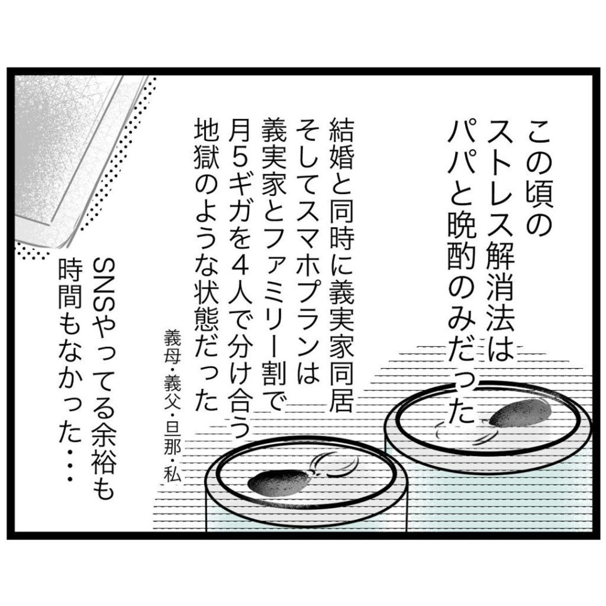 疲労とストレスで限界に近づいていたもっつんさん。義実家での生活は息が詰まり、唯一の息抜きは夫との晩酌だけです。