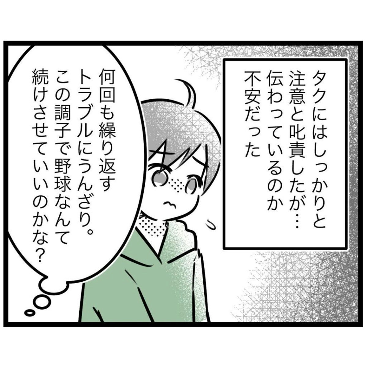 何度注意しても、トラブルを繰り返していた息子・タク。本人は野球を楽しんでいるのにやめさせるのは酷ですが、これ以上野球を続けるのは周囲の迷惑になるのではと悩みます。