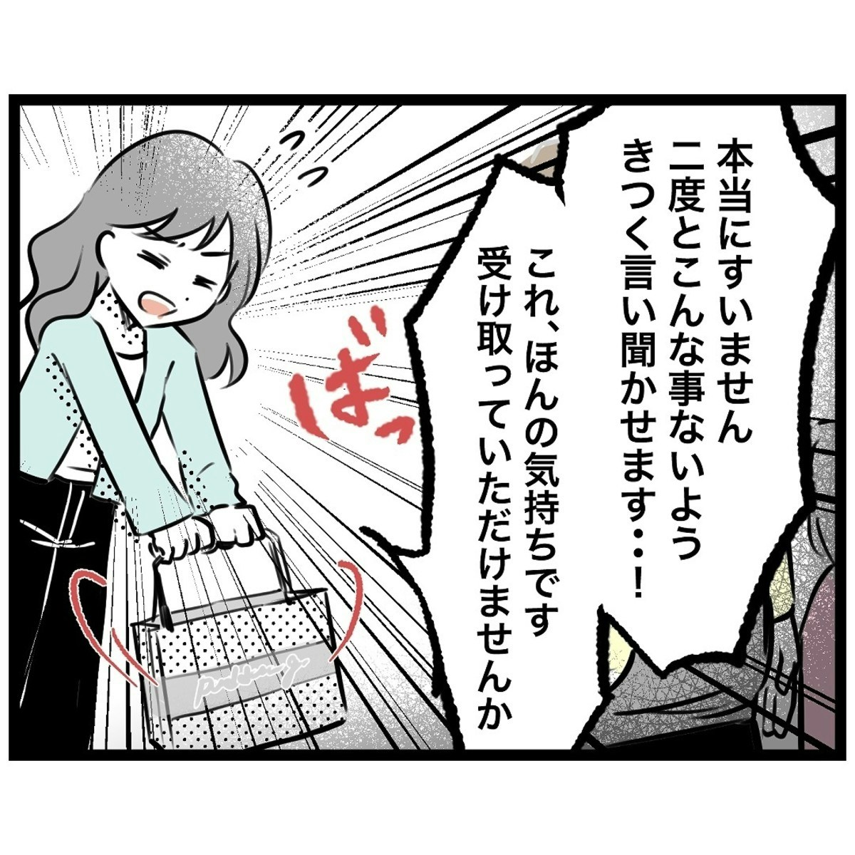 息子・タクがケガをさせてしまったチームメイトに謝罪したい一心で、「大丈夫」と言われているにもかかわらず、必死でお詫びのプリンを渡そうとするもっつんさん。気迫で相手ママを困惑させてしまいます。