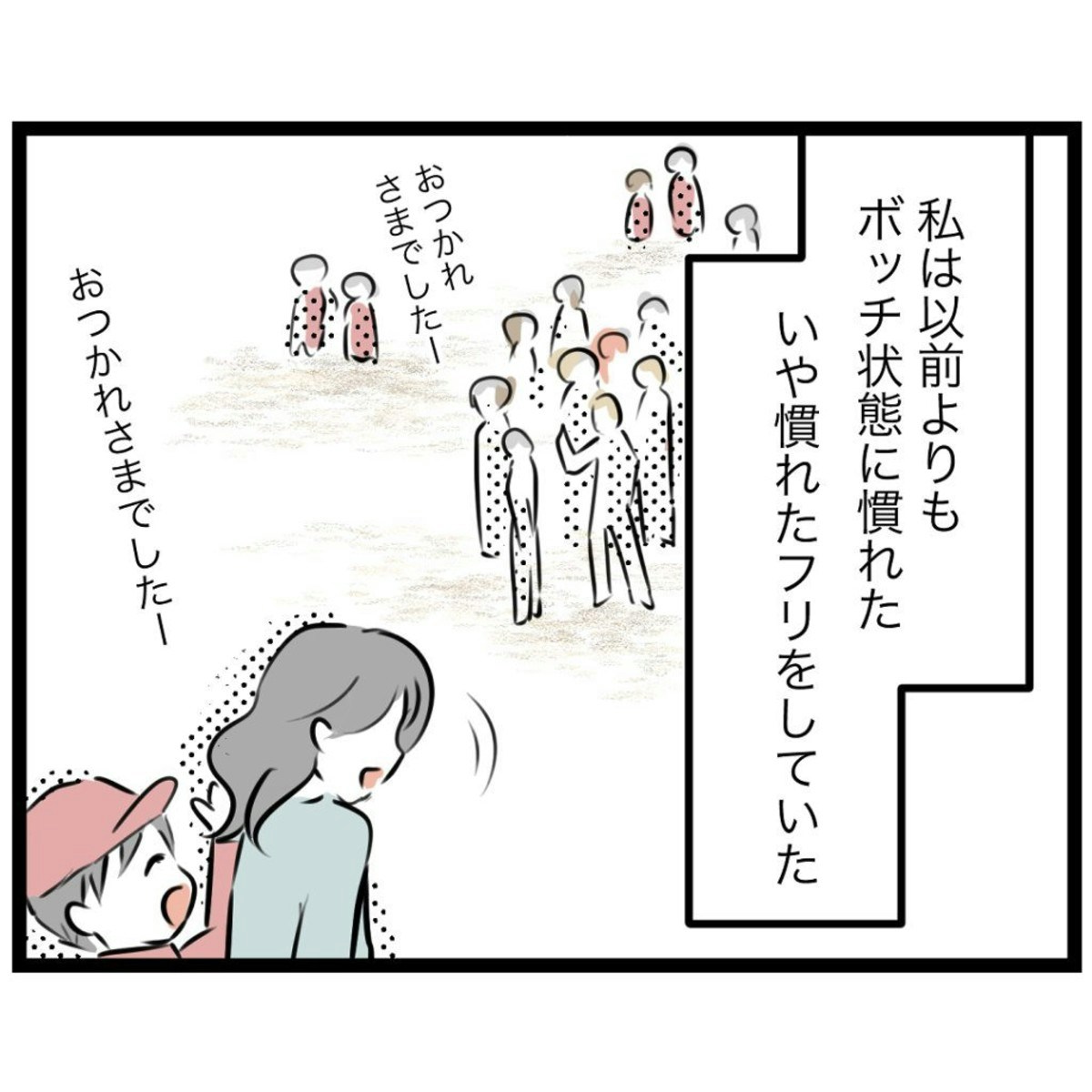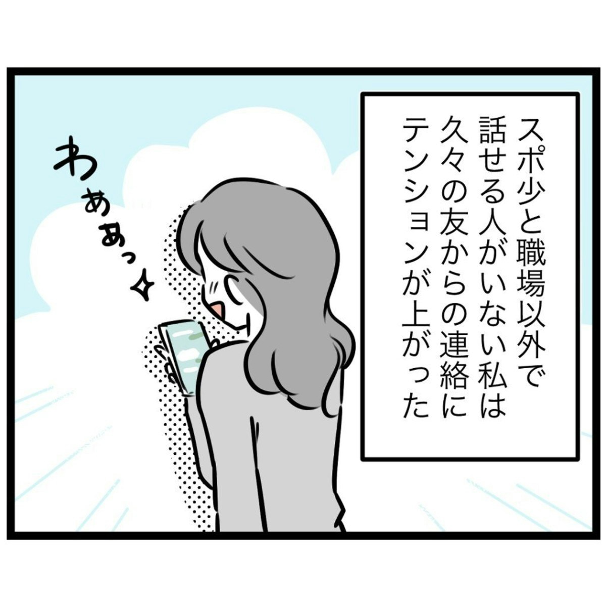 スポ少チームに入団して1年。もっつんさんは今も他の保護者になじめず、孤独のまま過ごしていました。寂しさを感じつつも、平気なふりをして日々をやり過ごします。そんなある日、久しぶりに届いた友人からの連絡に、ふと心が弾みます。