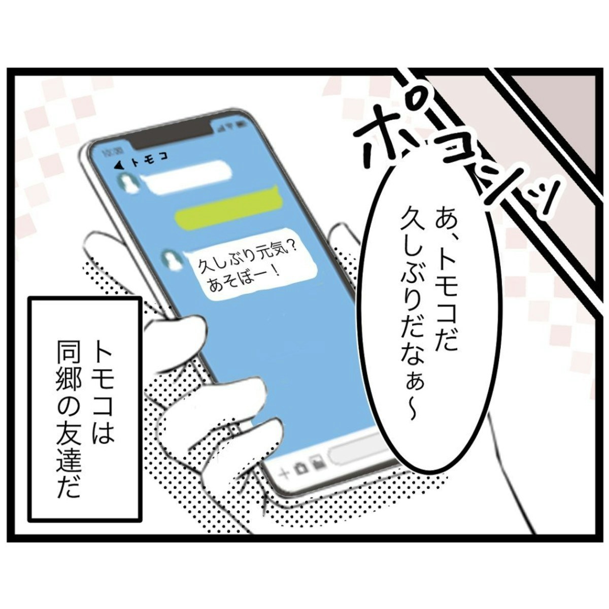 話せる人はスポ少野球か職場しかいない生活を送っていたもっつんさんのもとに、同郷の友達・トモコから連絡がありました。久々の連絡に、もっつんさんの心は踊ります。